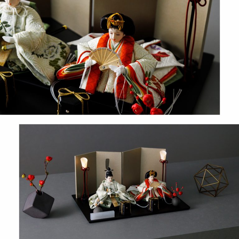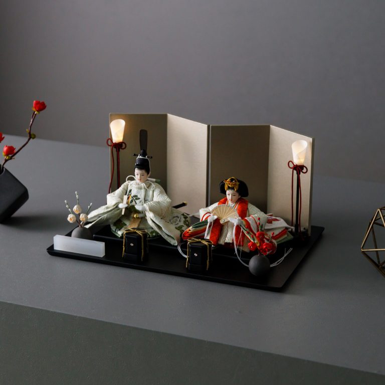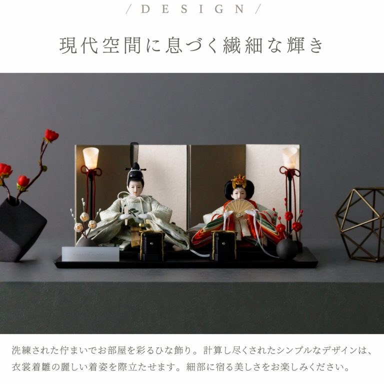 人形のお顔、飾り台、お道具まですべてにこだわり抜いて制作した、preferプロデュースの雛人形。熟練の職人たちがその技術を惜しみなく注いだ、本格派かつ高級志向のハイグレードなおひな様です。流行に左右されないシンプルモダンなスタイルのひな飾りは、時代を超えてどんな日の雛祭りにも華を添えます。衣裳着雛人形の美しい着姿を楽しめる親王飾り。かわいいお顔のお殿様とお姫様が優しく微笑みます。掌に収まるほどの極々小サイズ。どんな場所でも楽しめる大きさながら、凛とした存在感を放ちます。煌めく金糸を用いた金襴衣裳は、おめでたい日の雰囲気をいっそう盛り上げてくれるでしょう。飾り台には主役のお人形が映える黒一色の台座を使用。華やかな金の四曲屏風と共に、ひな人形のお衣裳を引き立てます。組立て不要な平飾りタイプは設置もお手軽。繊細で美しいお道具もセットになり、華やかかつ豪華な雛飾りに仕上げました。雛人形を照らす可愛い油灯はコードレス式。女の子の初節句のお祝いやギフトにおすすめのおひな様です。