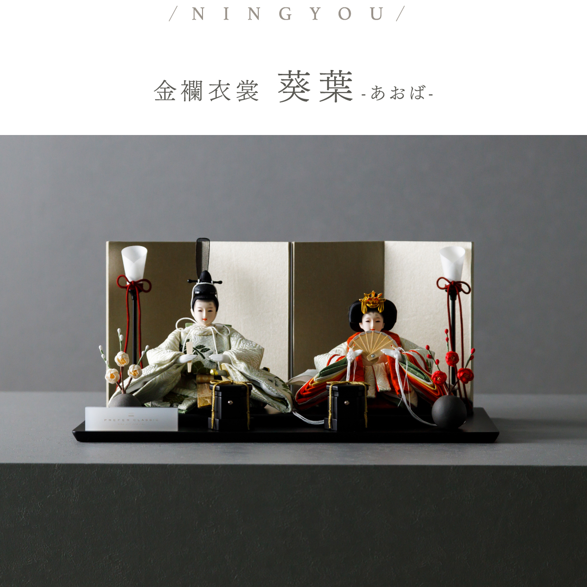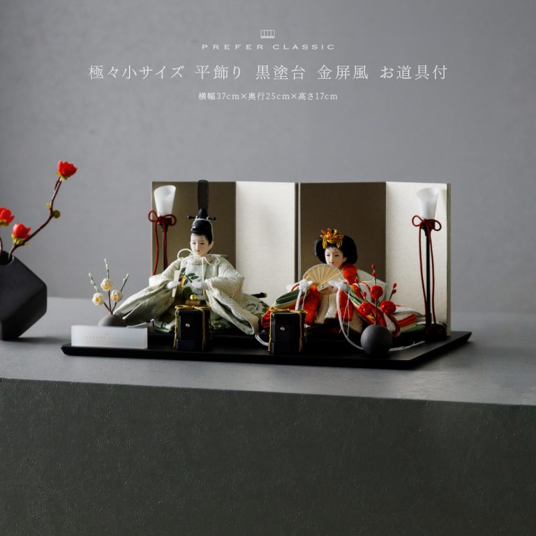 PREFER CLASSIC ひな人形 [黒塗台 金屏風 平飾り お道具付 貝桶 油灯 紅白梅 人形極々小サイズ 葵葉]