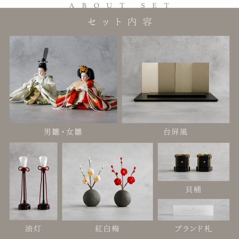 TOP > 雛人形 > ブランド > PREFER CLASSIC > PREFER CLASSIC ひな人形 [黒塗台 金屏風 平飾り お道具付 貝桶 油灯 紅白梅 人形極々小サイズ 葵葉]
