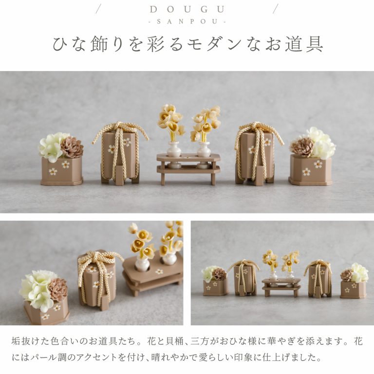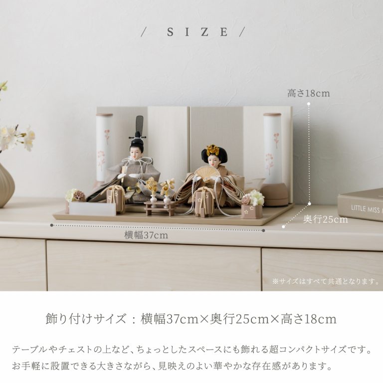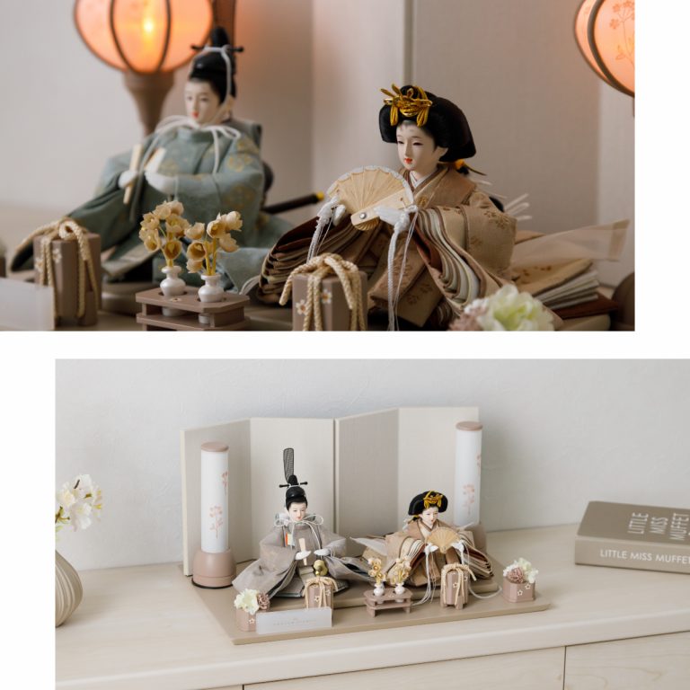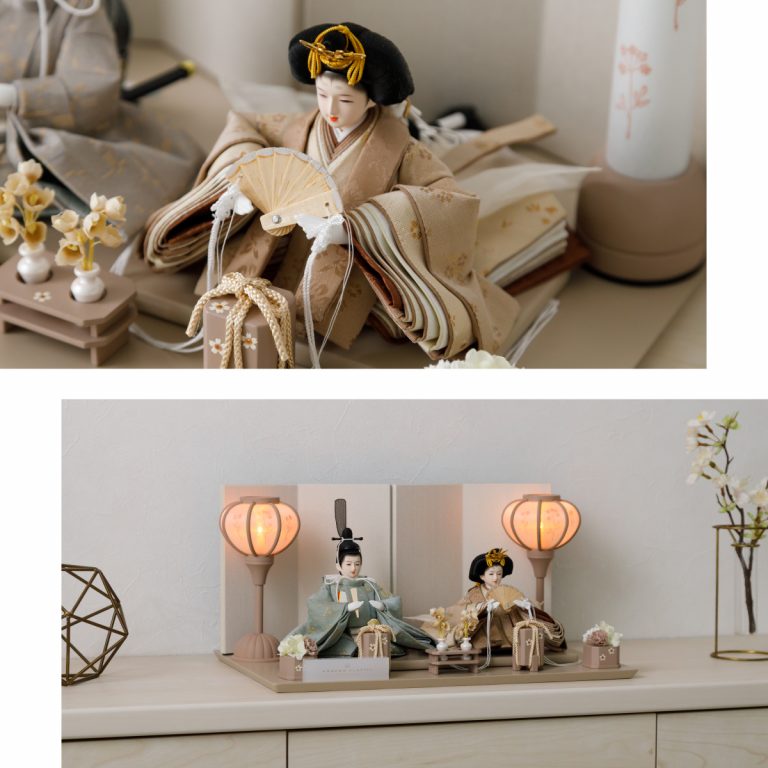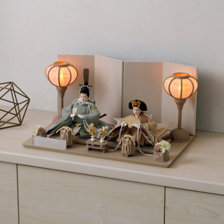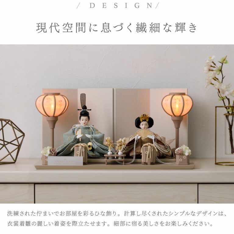 人形のお顔、飾り台、お道具まですべてにこだわり抜いて制作した、preferプロデュースの雛人形。熟練の職人たちがその技術を惜しみなく注いだ、本格派かつ高級志向のハイグレードなおひな様です。流行に左右されないシンプルモダンなスタイルのひな飾りは、時代を超えてどんな日の雛祭りにも華を添えます。衣裳着雛人形の美しい着姿を楽しめる親王飾り。かわいいお顔のお殿様とお姫様が優しく微笑みます。掌に収まるほどの極々小サイズ。どんな場所でも楽しめる大きさながら、凛とした存在感を放ちます。上品な艶と色合いが美しい綿織物のお衣裳は、おめでたい日の雰囲気をいっそう盛り上げてくれるでしょう。飾り台にはインテリアに合わせやすいベージュの台座を使用。ホワイトグレーの屏風と共に、ひな人形のお衣裳を引き立てます。平飾りタイプは組立ても不要でお手軽。繊細で美しいお道具もセットになり、華やかかつ豪華な雛飾りに仕上げました。雛人形を照らすあかりは雪洞、行灯からお選びください。初節句のお祝いやギフトにおすすめのおひな様です。