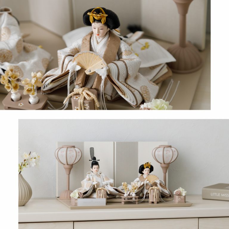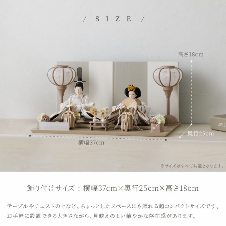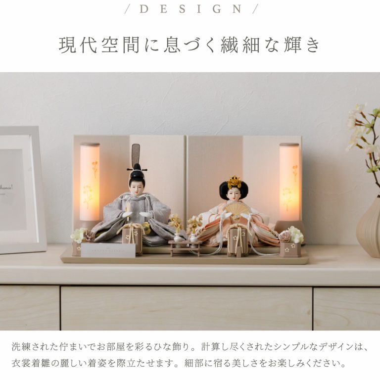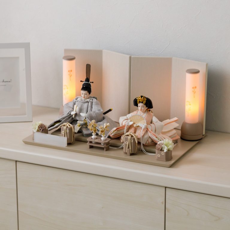 人形のお顔、飾り台、お道具まですべてにこだわり抜いて制作した、preferプロデュースの雛人形。熟練の職人たちがその技術を惜しみなく注いだ、本格派かつ高級志向のハイグレードなおひな様です。流行に左右されないシンプルモダンなスタイルのひな飾りは、時代を超えてどんな日の雛祭りにも華を添えます。衣裳着雛人形の美しい着姿を楽しめる親王飾り。かわいいお顔のお殿様とお姫様が優しく微笑みます。掌に収まるほどの極々小サイズ。どんな場所でも楽しめる大きさながら、凛とした存在感を放ちます。上品な艶と色合いが美しい人絹生地のお衣裳は、おめでたい日の雰囲気をいっそう盛り上げてくれるでしょう。飾り台にはインテリアに合わせやすいベージュの台座を使用。ホワイトグレーの屏風と共に、ひな人形のお衣裳を引き立てます。平飾りタイプは組立ても不要でお手軽。繊細で美しいお道具もセットになり、華やかかつ豪華な雛飾りに仕上げました。雛人形を照らすあかりは雪洞、行灯からお選びください。初節句のお祝いやギフトにおすすめのおひな様です。