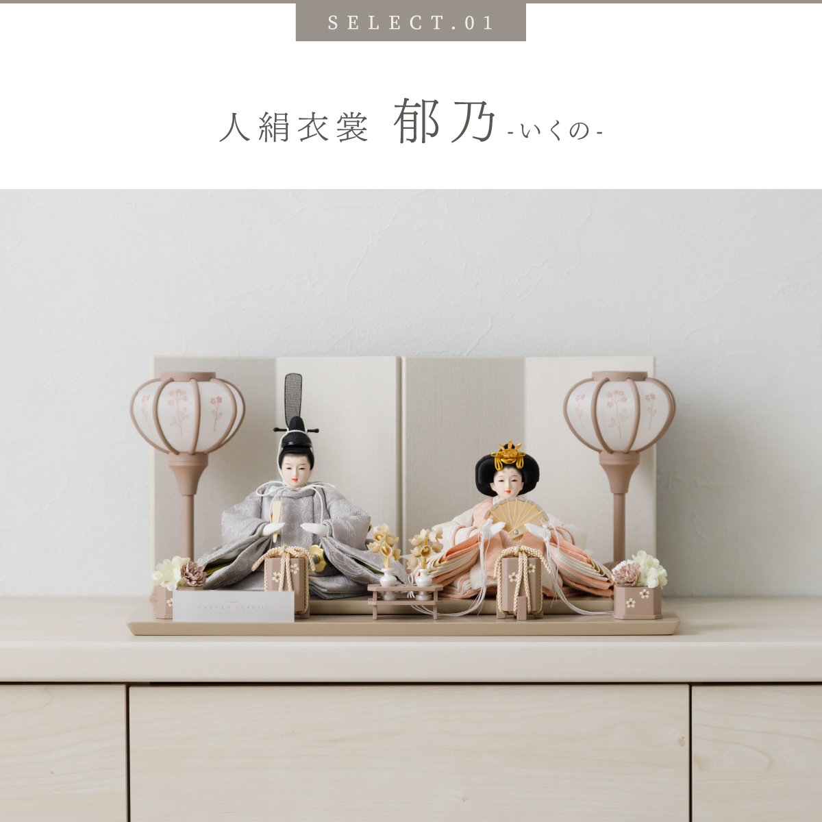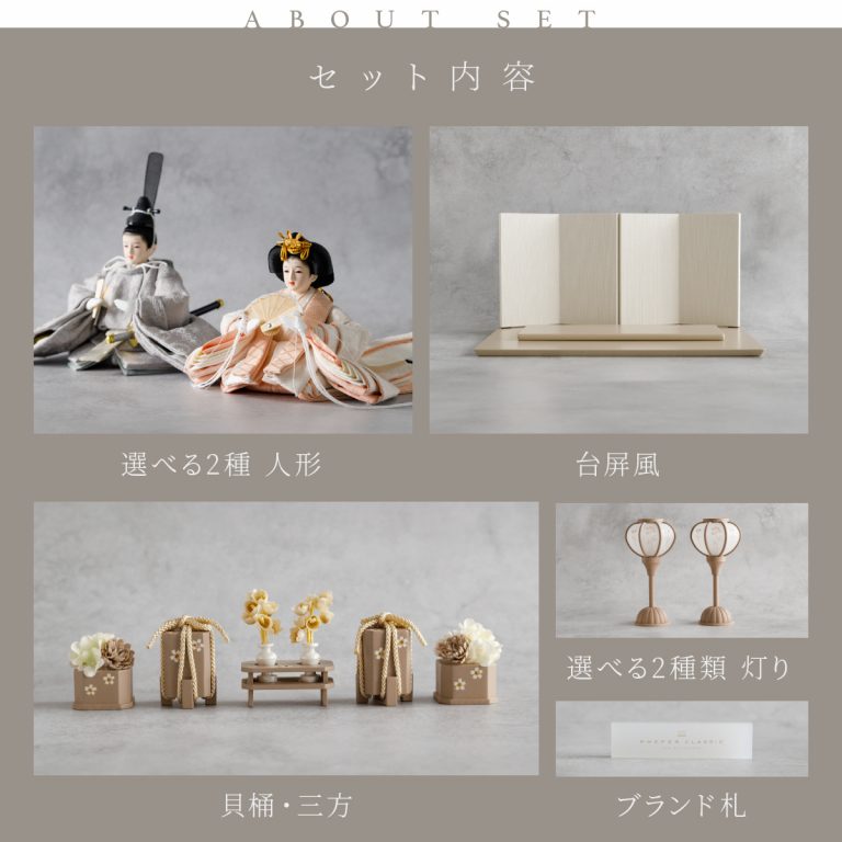 PREFER CLASSIC ひな人形 [ベージュ台 ホワイトグレー屏風 平飾り お道具付 貝桶花 人形極々小サイズ 選べる人絹衣裳2種類 郁乃 優白 選べる灯り2種 雪洞 行灯]