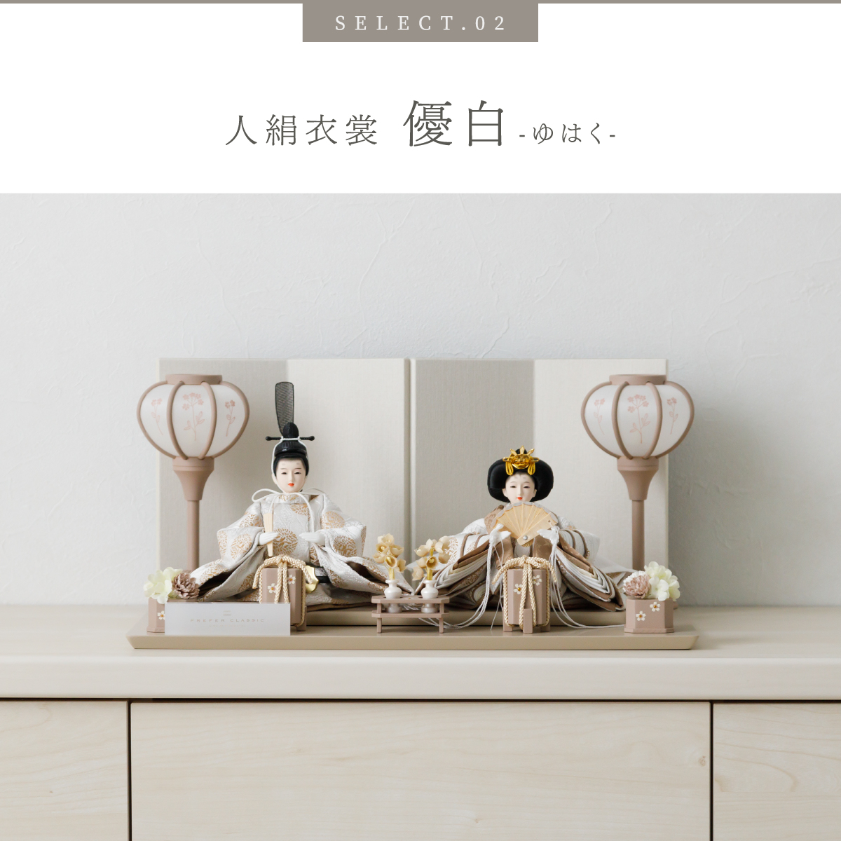 TOP > 雛人形 > ブランド > PREFER CLASSIC > PREFER CLASSIC ひな人形 [ベージュ台 ホワイトグレー屏風 平飾り お道具付 貝桶花 人形極々小サイズ 選べる人絹衣裳2種類 郁乃 優白 選べる灯り2種 雪洞 行灯]