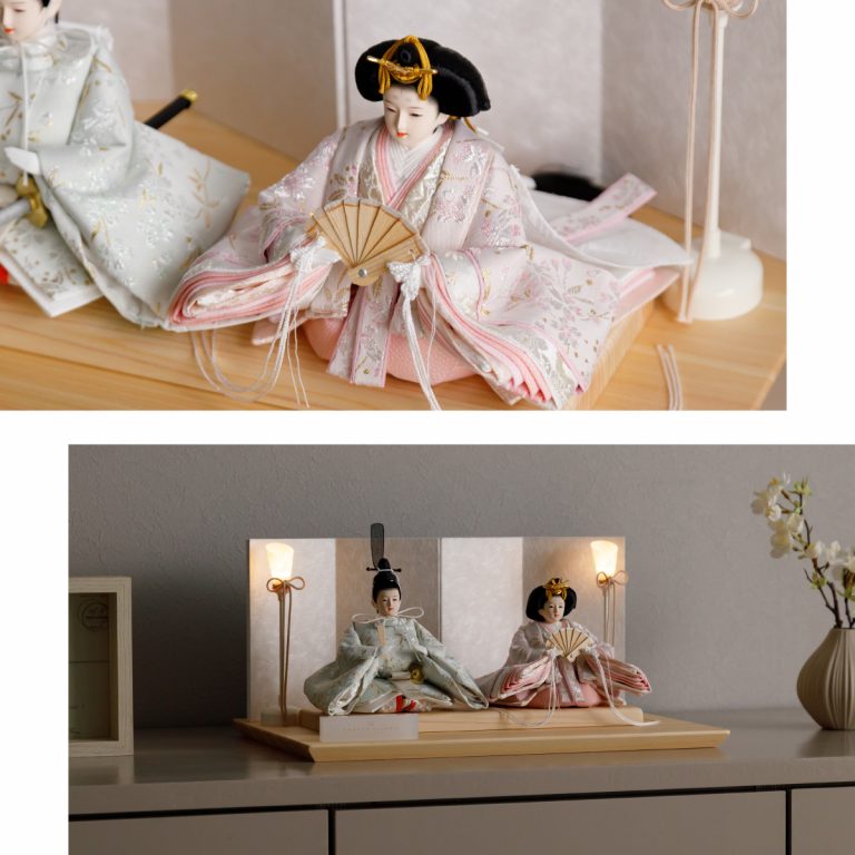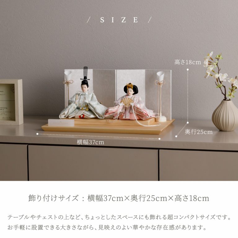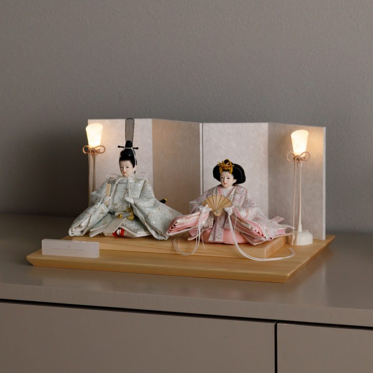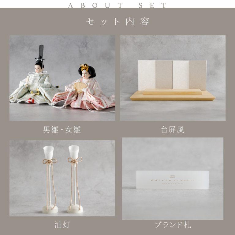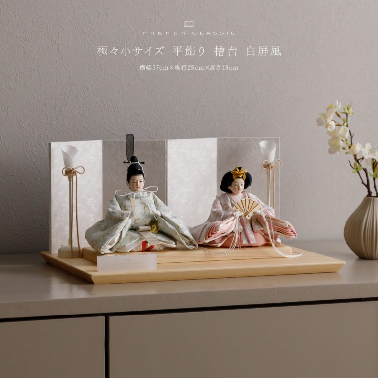 人形のお顔、飾り台、お道具まですべてにこだわり抜いて制作した、preferプロデュースの雛人形。熟練の職人たちがその技術を惜しみなく注いだ、本格派かつ高級志向のハイグレードなおひな様です。流行に左右されないシンプルモダンなスタイルのひな飾りは、時代を超えてどんな日の雛祭りにも華を添えます。衣裳着雛人形の美しい着姿を楽しめる親王飾り。かわいいお顔のお殿様とお姫様が優しく微笑みます。掌に収まるほどの極々小サイズ。どんな場所でも楽しめる大きさながら、凛とした存在感を放ちます。煌めく金糸を用いた金襴衣裳は、おめでたい日の雰囲気をいっそう盛り上げてくれるでしょう。飾り台には肌目の美しい檜(ヒノキ)の台座を使用。趣深い白の四曲屏風と共に、ひな人形のお衣裳を引き立てます。組立て不要な平飾りタイプは設置もお手軽。あえてお道具を配さないシンプルなスタイルの雛飾りは、お人形そのものの美しさを際立たせます。雛人形を照らす可愛い油灯はコードレス式。女の子の初節句のお祝いやギフトにおすすめのおひな様です。