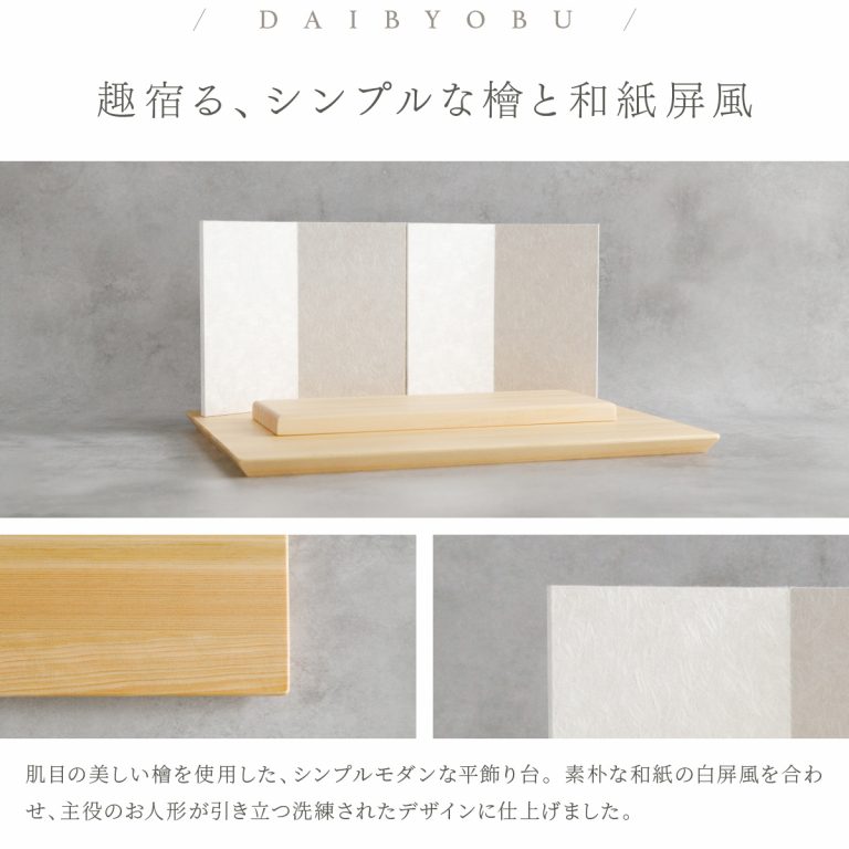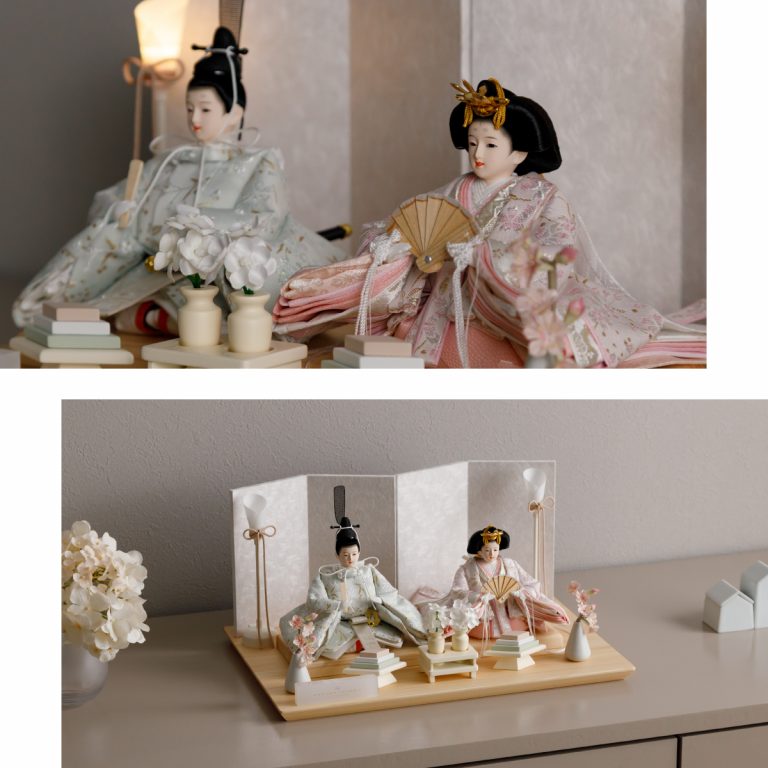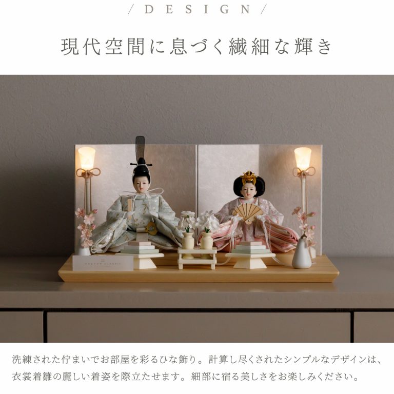 人形のお顔、飾り台、お道具まですべてにこだわり抜いて制作した、preferプロデュースの雛人形。熟練の職人たちがその技術を惜しみなく注いだ、本格派かつ高級志向のハイグレードなおひな様です。流行に左右されないシンプルモダンなスタイルのひな飾りは、時代を超えてどんな日の雛祭りにも華を添えます。衣裳着雛人形の美しい着姿を楽しめる親王飾り。かわいいお顔のお殿様とお姫様が優しく微笑みます。掌に収まるほどの極々小サイズ。どんな場所でも楽しめる大きさながら、凛とした存在感を放ちます。煌めく金糸を用いた金襴衣裳は、おめでたい日の雰囲気をいっそう盛り上げてくれるでしょう。飾り台には肌目の美しい檜(ヒノキ)の台座を使用。趣深い白の四曲屏風と共に、ひな人形のお衣裳を引き立てます。組立て不要な平飾りタイプは設置もお手軽。繊細で美しいお道具もセットになり、華やかかつ豪華な雛飾りに仕上げました。雛人形を照らす可愛い油灯はコードレス式。女の子の初節句のお祝いやギフトにおすすめのおひな様です。