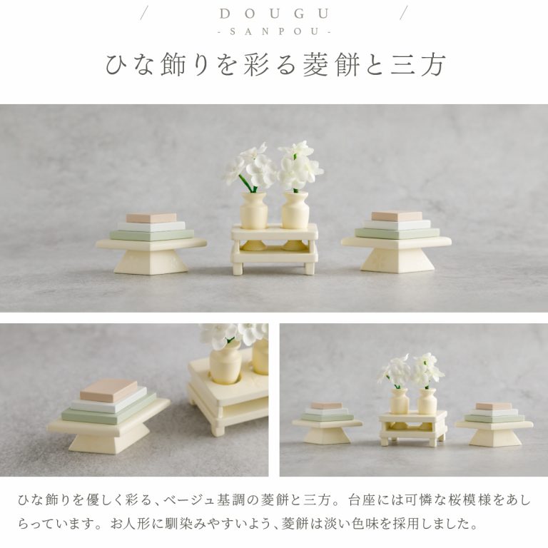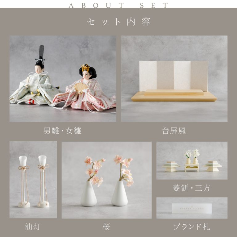 PREFER CLASSIC ひな人形 [檜台 白屏風 平飾り お道具付 菱餅三方 油灯 枝桜ピンク 人形極々小サイズ 金襴衣裳 君華]