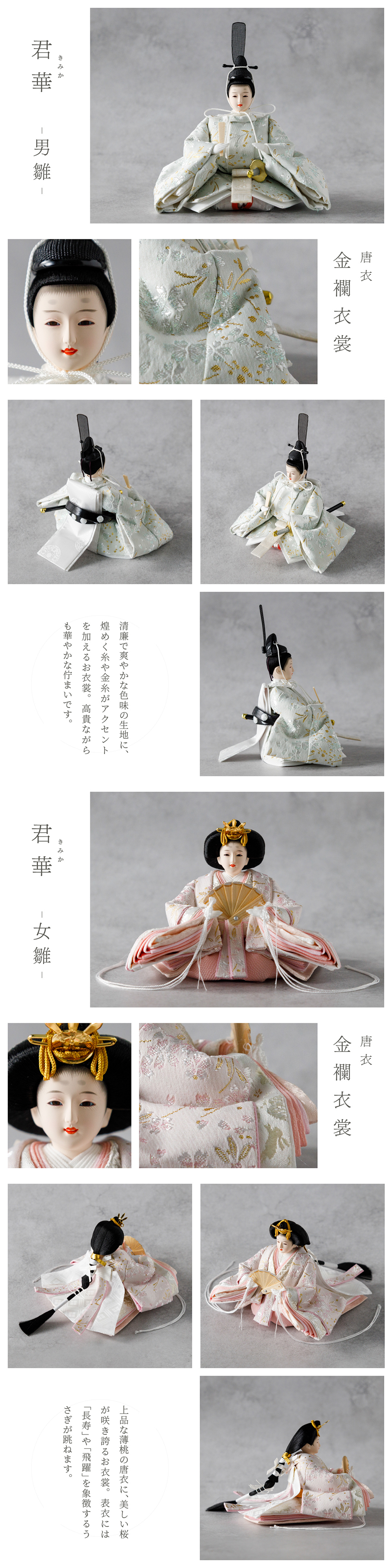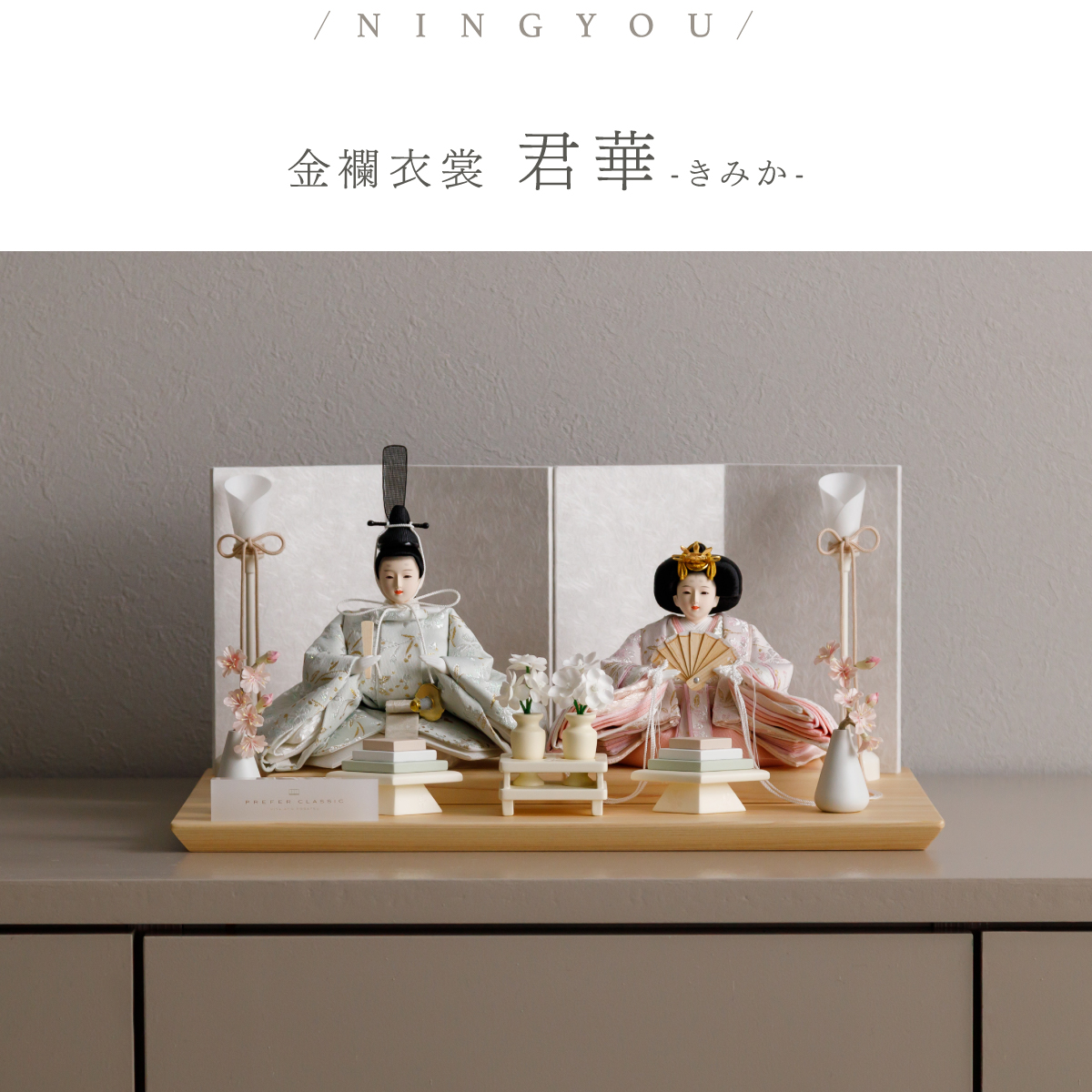 PREFER CLASSIC ひな人形 [檜台 白屏風 平飾り お道具付 菱餅三方 油灯 枝桜ピンク 人形極々小サイズ 金襴衣裳 君華]