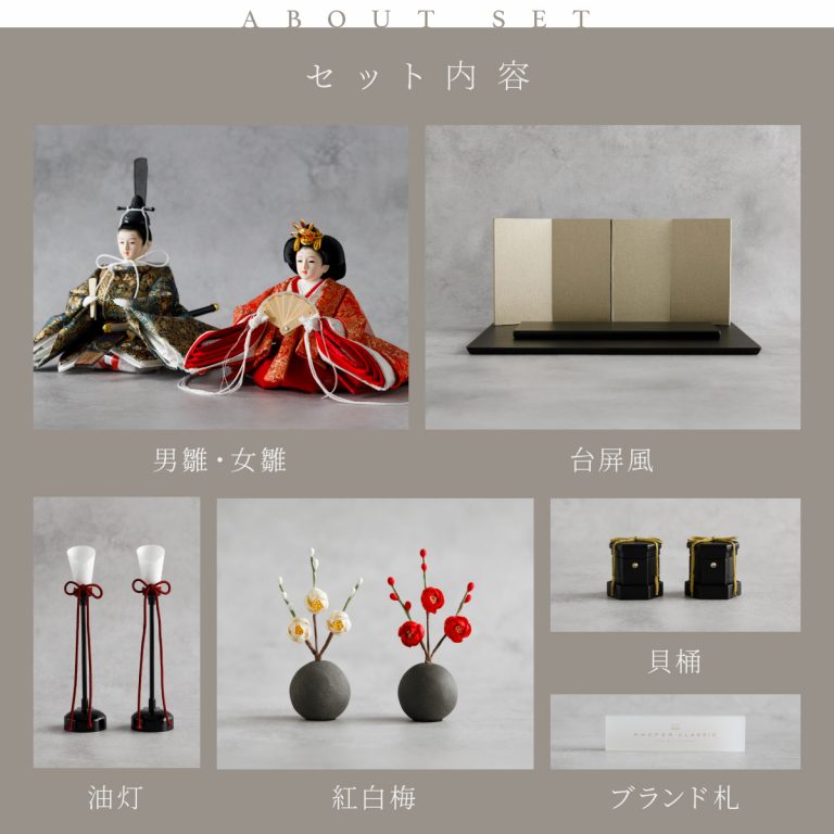 人形のお顔、飾り台、お道具まですべてにこだわり抜いて制作した、preferプロデュースの雛人形。熟練の職人たちがその技術を惜しみなく注いだ、本格派かつ高級志向のハイグレードなおひな様です。流行に左右されないシンプルモダンなスタイルのひな飾りは、時代を超えてどんな日の雛祭りにも華を添えます。衣裳着雛人形の美しい着姿を楽しめる親王飾り。かわいいお顔のお殿様とお姫様が優しく微笑みます。掌に収まるほどの極々小サイズ。どんな場所でも楽しめる大きさながら、凛とした存在感を放ちます。煌めく金糸を用いた金襴衣裳は、おめでたい日の雰囲気をいっそう盛り上げてくれるでしょう。飾り台には主役のお人形が映える黒一色の台座を使用。華やかな金の四曲屏風と共に、ひな人形のお衣裳を引き立てます。組立て不要な平飾りタイプは設置もお手軽。繊細で美しいお道具もセットになり、華やかかつ豪華な雛飾りに仕上げました。雛人形を照らす可愛い油灯はコードレス式。女の子の初節句のお祝いやギフトにおすすめのおひな様です。