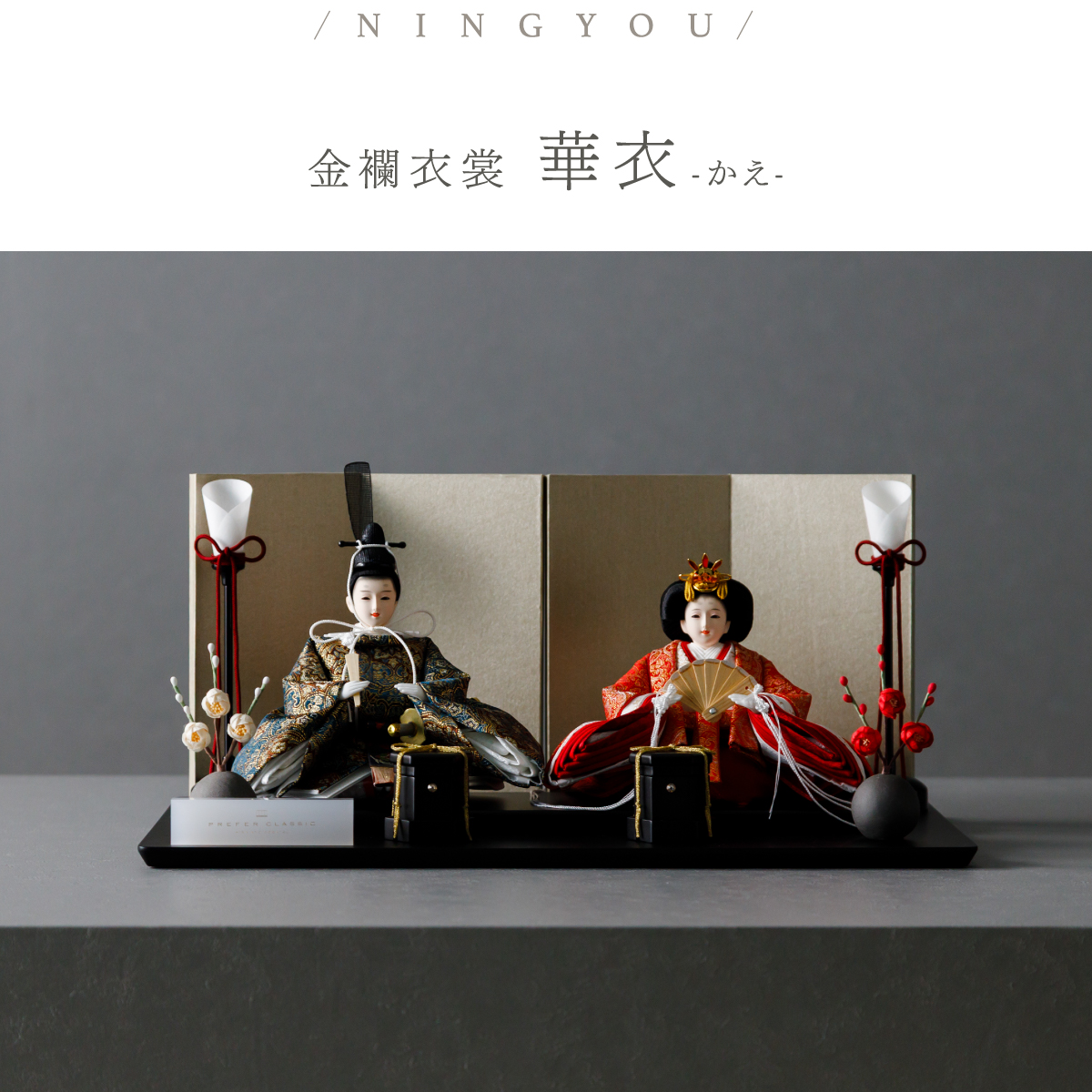 PREFER CLASSIC ひな人形 [黒塗台 金屏風 平飾り お道具付 貝桶 油灯 紅白梅 人形極々小サイズ 金襴衣裳 華衣]