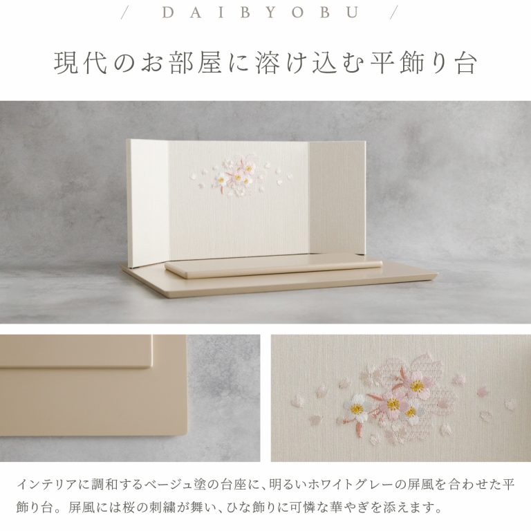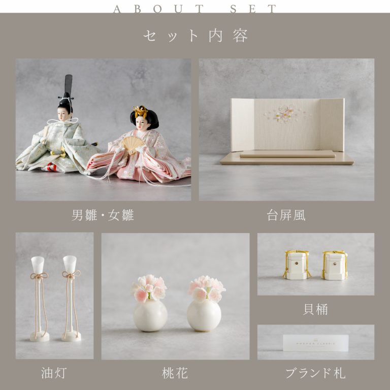 PREFER CLASSIC ひな人形 [ベージュ台 桜霞屏風 平飾り お道具付 貝桶 油灯 桜橘 人形極々小サイズ 金襴衣裳 君華]