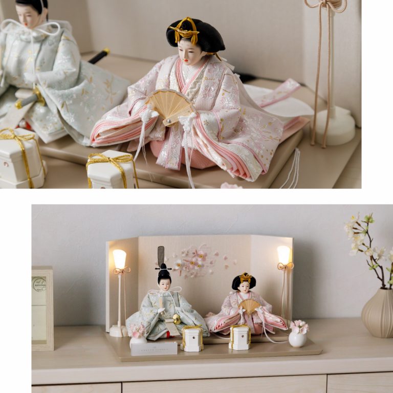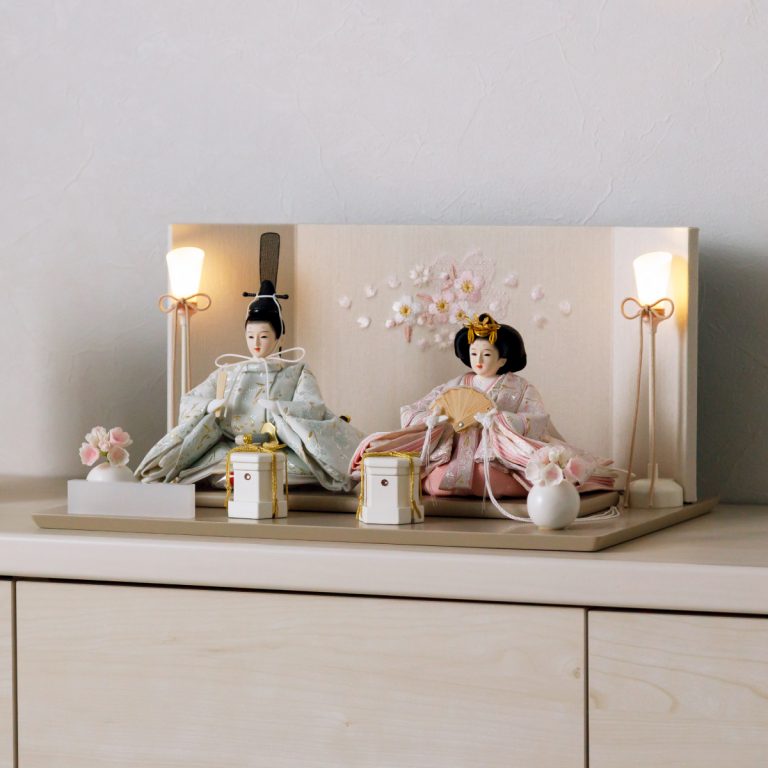 人形のお顔、飾り台、お道具まですべてにこだわり抜いて制作した、preferプロデュースの雛人形。熟練の職人たちがその技術を惜しみなく注いだ、本格派かつ高級志向のハイグレードなおひな様です。流行に左右されないシンプルモダンなスタイルのひな飾りは、時代を超えてどんな日の雛祭りにも華を添えます。衣裳着雛人形の美しい着姿を楽しめる親王飾り。かわいいお顔のお殿様とお姫様が優しく微笑みます。掌に収まるほどの極々小サイズ。どんな場所でも楽しめる大きさながら、凛とした存在感を放ちます。煌めく金糸を用いた金襴衣裳は、おめでたい日の雰囲気をいっそう盛り上げてくれるでしょう。飾り台にはインテリアに合わせやすいベージュの台座を使用。繊細な刺繍を施した屏風と共に、ひな人形のお衣裳を引き立てます。平飾りタイプは組立ても不要でお手軽。繊細で美しいお道具もセットになり、華やかかつ豪華な雛飾りに仕上げました。雛人形を照らす可愛い油灯はコードレス式。女の子の初節句のお祝いやギフトにおすすめのおひな様です。
