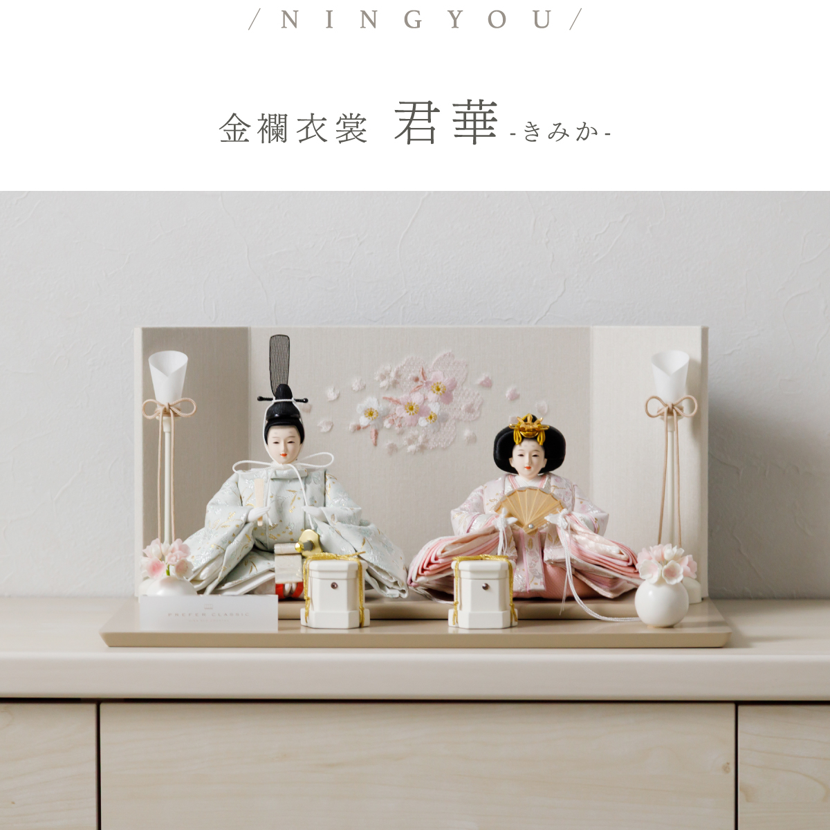 PREFER CLASSIC ひな人形 [ベージュ台 桜霞屏風 平飾り お道具付 貝桶 油灯 桜橘 人形極々小サイズ 金襴衣裳 君華]