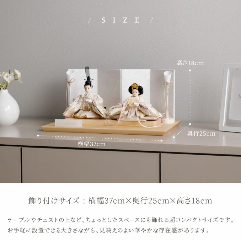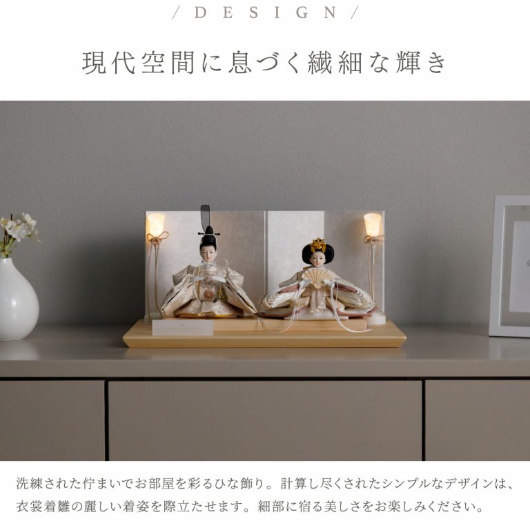 人形のお顔、飾り台、お道具まですべてにこだわり抜いて制作した、preferプロデュースの雛人形。熟練の職人たちがその技術を惜しみなく注いだ、本格派かつ高級志向のハイグレードなおひな様です。流行に左右されないシンプルモダンなスタイルのひな飾りは、時代を超えてどんな日の雛祭りにも華を添えます。衣裳着雛人形の美しい着姿を楽しめる親王飾り。かわいいお顔のお殿様とお姫様が優しく微笑みます。掌に収まるほどの極々小サイズ。どんな場所でも楽しめる大きさながら、凛とした存在感を放ちます。上品な艶と色合いが美しい人絹生地のお衣裳は、おめでたい日の雰囲気をいっそう盛り上げてくれるでしょう。飾り台には肌目の美しい檜(ヒノキ)の台座を使用。趣深い白の四曲屏風と共に、ひな人形のお衣裳を引き立てます。組立て不要な平飾りタイプは設置もお手軽。あえてお道具を配さないシンプルなスタイルの雛飾りは、お人形そのものの美しさを際立たせます。雛人形を照らす可愛い油灯はコードレス式。女の子の初節句のお祝いやギフトにおすすめのおひな様です。