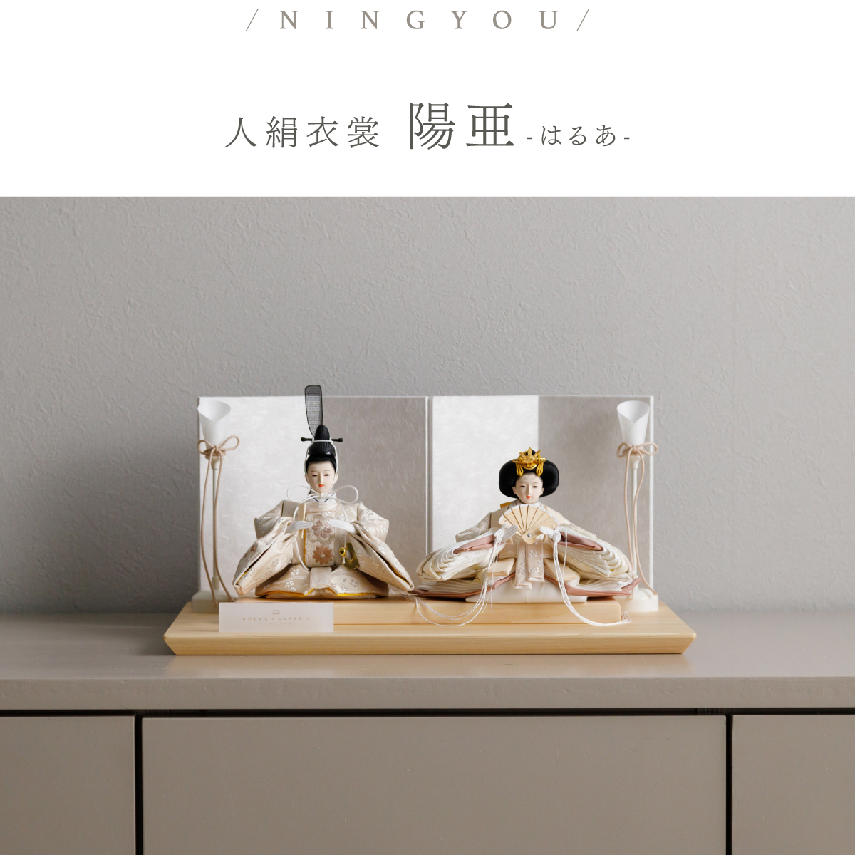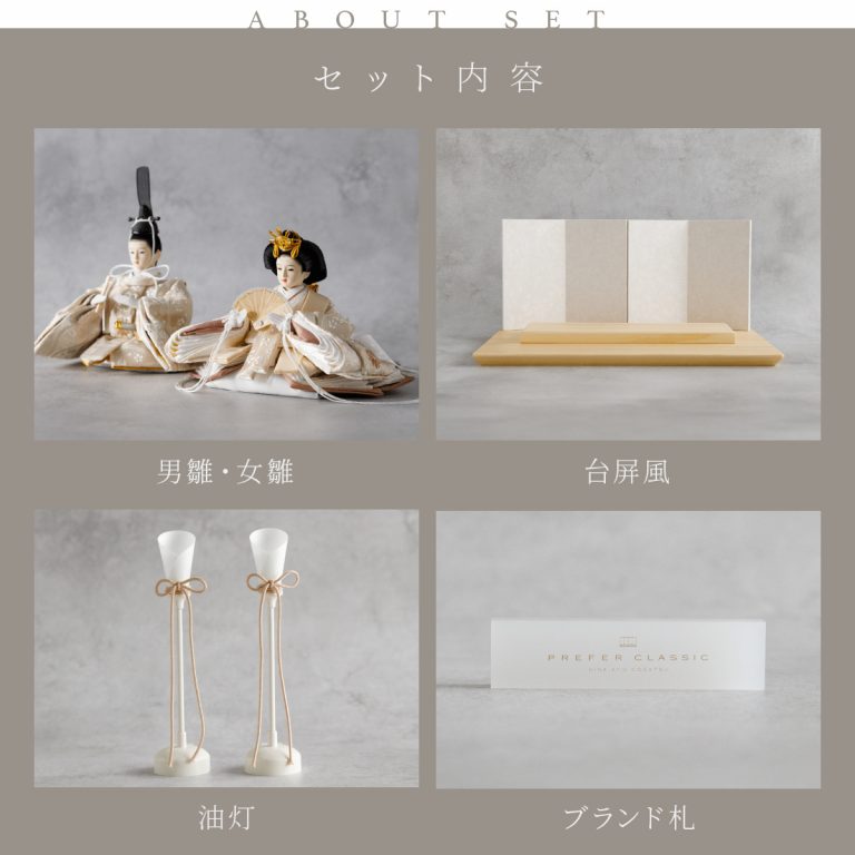 TOP > 雛人形 > ブランド > PREFER CLASSIC > PREFER CLASSIC ひな人形 [檜台 白屛風 平飾り 油灯 人形極々小サイズ 人絹衣裳 陽亜]