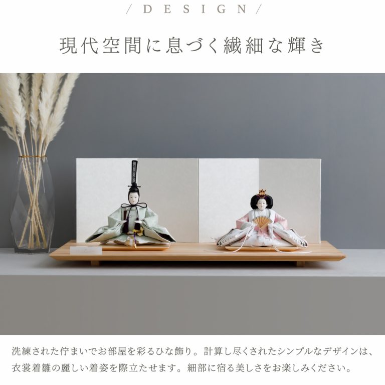 人形のお顔、飾り台、お道具まですべてにこだわり抜いて制作した、preferプロデュースの雛人形。熟練の職人たちがその技術を惜しみなく注いだ、本格派かつ高級志向のハイグレードなおひな様です。流行に左右されないシンプルモダンなスタイルのひな飾りは、時代を超えてどんな日の雛祭りにも華を添えます。衣裳着雛人形の美しい着姿を楽しめる親王飾り。かわいいお顔のお殿様とお姫様が優しく微笑みます。ゆったりとした場所で飾れるサイズ感。存在感を放ちつつインテリアのようにお部屋に溶け込みます。高級感あふれる正絹生地のお衣裳は、おめでたい日の雰囲気をいっそう盛り上げてくれるでしょう。飾り台には肌目の美しい檜(ヒノキ)の台座を使用。趣深い白の四曲屏風と共に、ひな人形のお衣裳を引き立てます。組立て不要な平飾りタイプは設置もお手軽。あえてお道具を配さないシンプルなスタイルの雛飾りは、お人形そのものの美しさを際立たせます。
