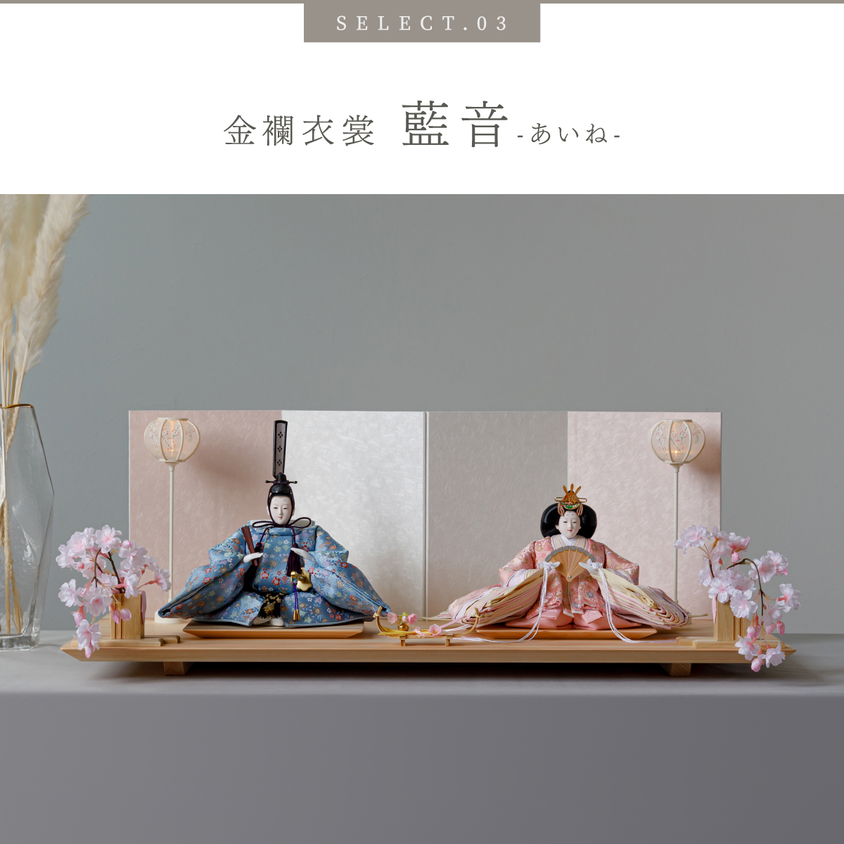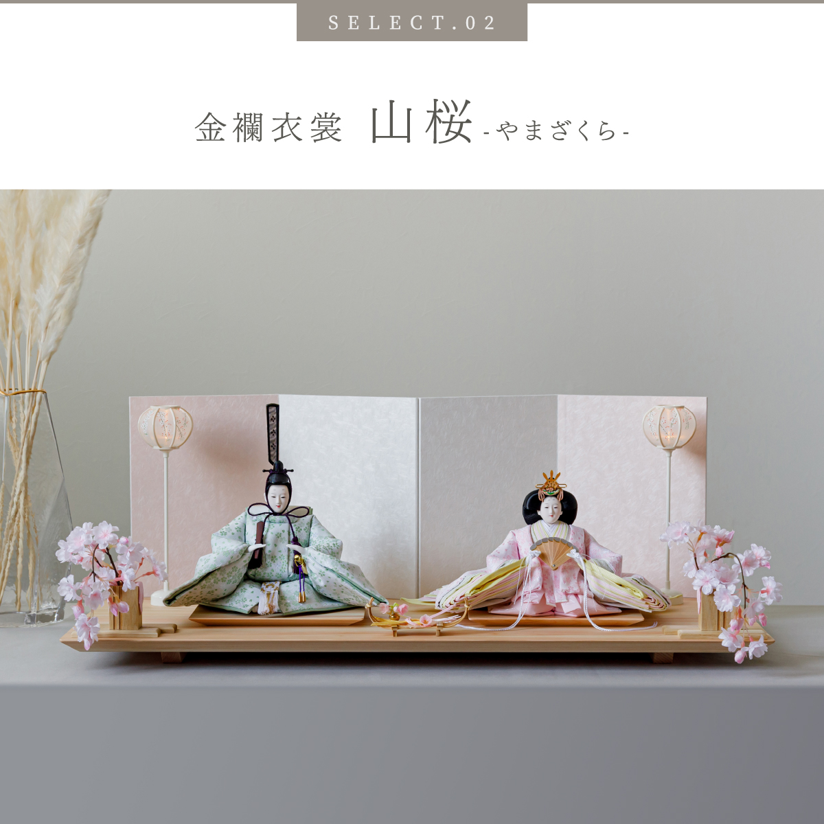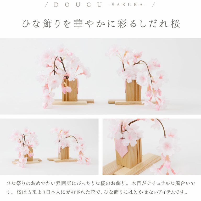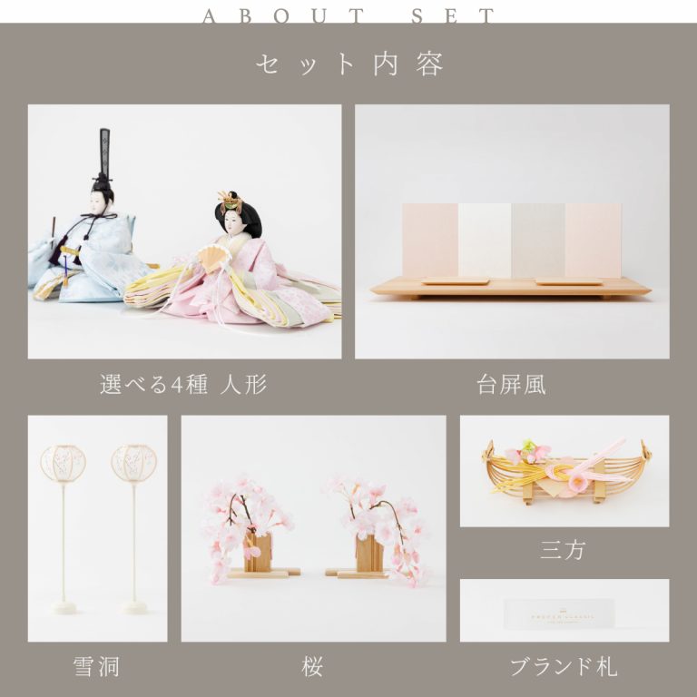 PREFER CLASSIC ひな人形 [檜台 桃白屏風 平飾り お道具付 しだれ桜 三方小桜 雪洞 人形大サイズ 選べる金襴衣裳4種類 美鈴 山桜 藍音 蒼梅]