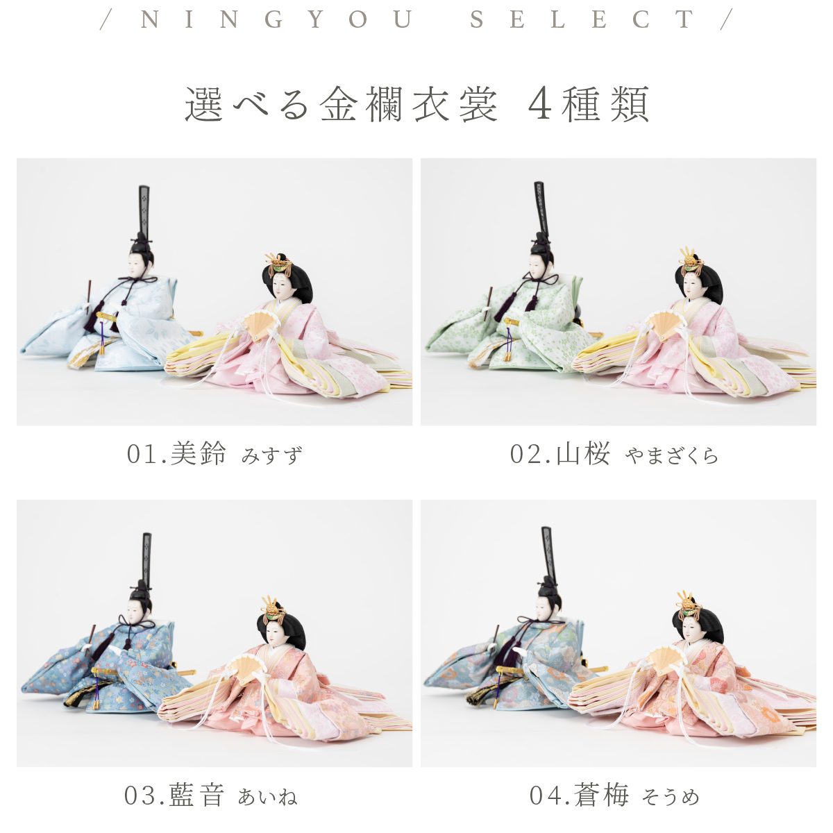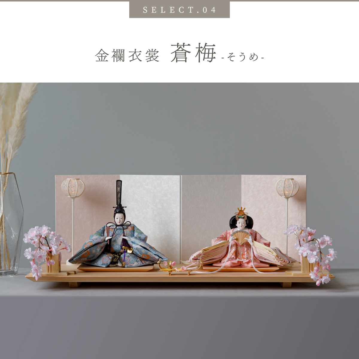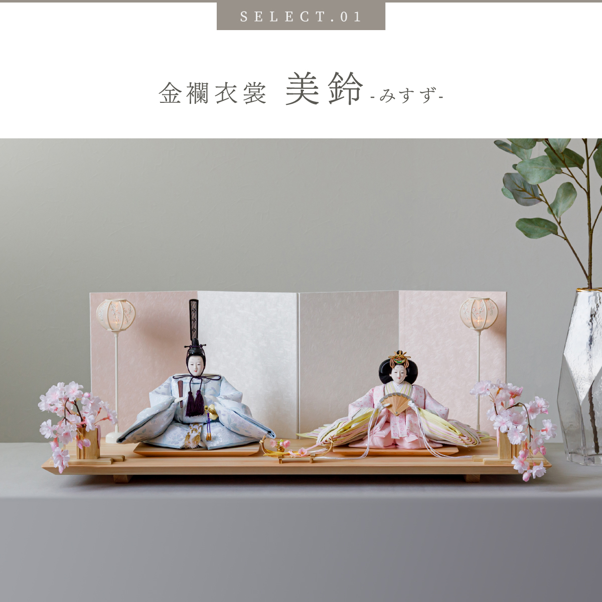PREFER CLASSIC ひな人形 [檜台 桃白屏風 平飾り お道具付 しだれ桜 三方小桜 雪洞 人形大サイズ 選べる金襴衣裳4種類 美鈴 山桜 藍音 蒼梅]