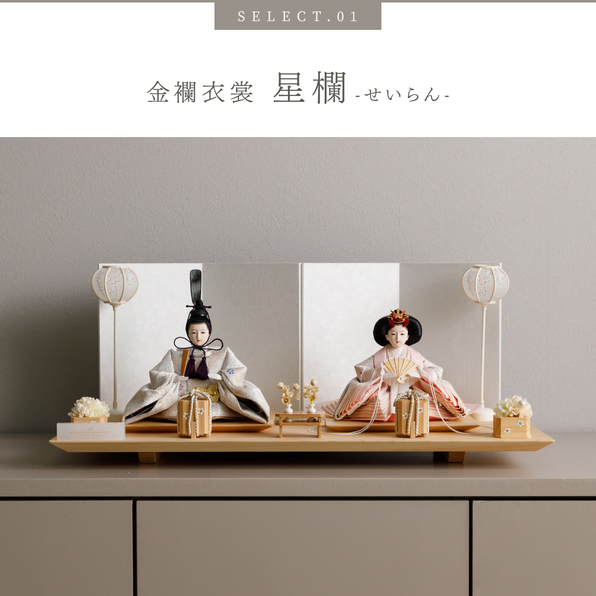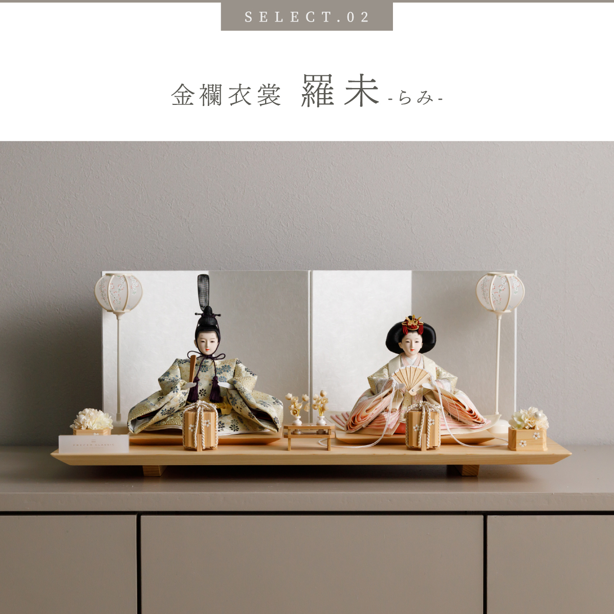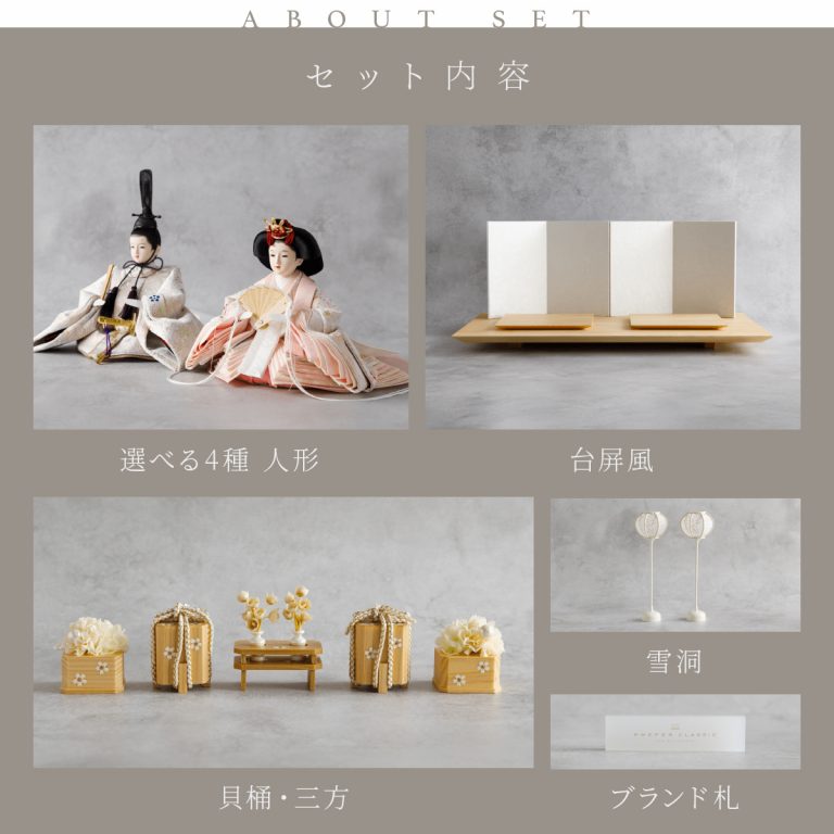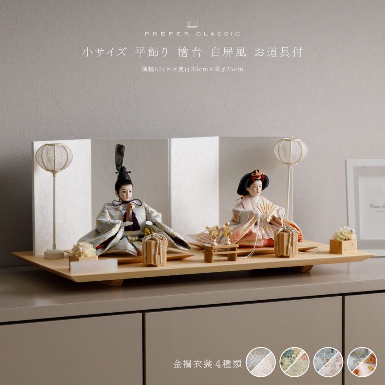 PREFER CLASSIC ひな人形 [檜台 白屏風 平飾り お道具付 貝桶花 雪洞 人形小サイズ 選べる金襴衣裳4種類 星欄 羅未 桜央 絃凪]