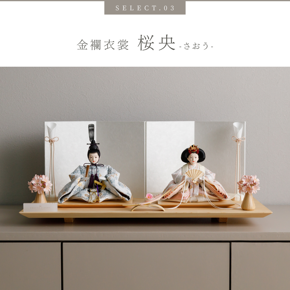PREFER CLASSIC ひな人形 [檜台 白屏風 平飾り お道具付 和桜 三方桜 選べる灯り2種 油灯 雪洞 人形小サイズ 選べる金襴衣裳4種類 星欄 羅未 桜央 絃凪]