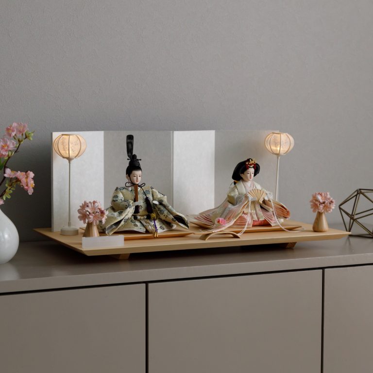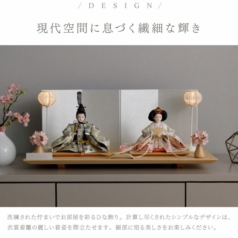 人形のお顔、飾り台、お道具まですべてにこだわり抜いて制作した、preferプロデュースの雛人形。熟練の職人たちがその技術を惜しみなく注いだ、本格派かつ高級志向のハイグレードなおひな様です。流行に左右されないシンプルモダンなスタイルのひな飾りは、時代を超えてどんな日の雛祭りにも華を添えます。衣裳着雛人形の美しい着姿を楽しめる親王飾り。かわいいお顔のお殿様とお姫様が優しく微笑みます。程よくコンパクトなサイズ感。存在感を放ちつつインテリアのようにお部屋に溶け込みます。煌めく金糸を用いた金襴衣裳は、おめでたい日の雰囲気をいっそう盛り上げてくれるでしょう。飾り台には肌目の美しい檜(ヒノキ)の台座を使用。趣深い白の四曲屏風と共に、ひな人形のお衣裳を引き立てます。組立て不要な平飾りタイプは設置もお手軽。繊細で美しいお道具もセットになり、華やかかつ豪華な雛飾りに仕上げました。雛人形を照らすあかりは雪洞、油灯からお選びください。初節句のお祝いやギフトにおすすめのおひな様です。