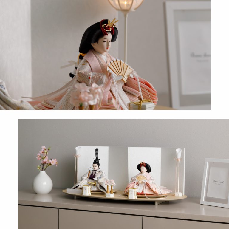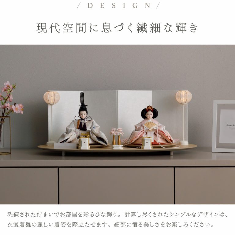 人形のお顔、飾り台、お道具まですべてにこだわり抜いて制作した、preferプロデュースの雛人形。熟練の職人たちがその技術を惜しみなく注いだ、本格派かつ高級志向のハイグレードなおひな様です。流行に左右されないシンプルモダンなスタイルのひな飾りは、時代を超えてどんな日の雛祭りにも華を添えます。衣裳着雛人形の美しい着姿を楽しめる親王飾り。かわいいお顔のお殿様とお姫様が優しく微笑みます。程よくコンパクトなサイズ感。存在感を放ちつつインテリアのようにお部屋に溶け込みます。煌めく金糸を用いた金襴衣裳は、おめでたい日の雰囲気をいっそう盛り上げてくれるでしょう。飾り台には上品な曲線を描く丸型の台座を使用。趣深い白の四曲屏風と共に、ひな人形のお衣裳を引き立てます。組立て不要な平飾りタイプは設置もお手軽。繊細で美しいお道具もセットになり、華やかかつ豪華な雛飾りに仕上げました。雛人形を照らすあかりは雪洞、油灯からお選びください。初節句のお祝いやギフトにおすすめのおひな様です。