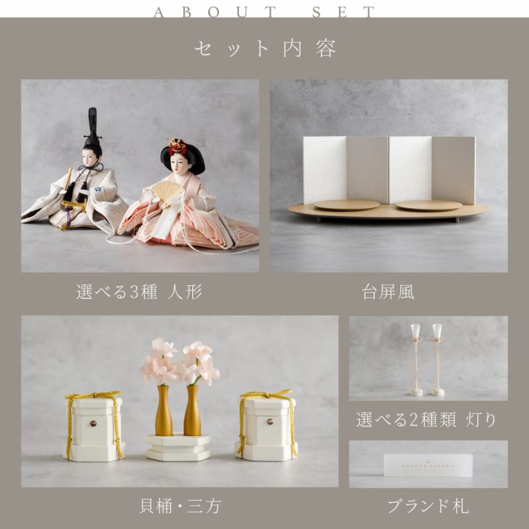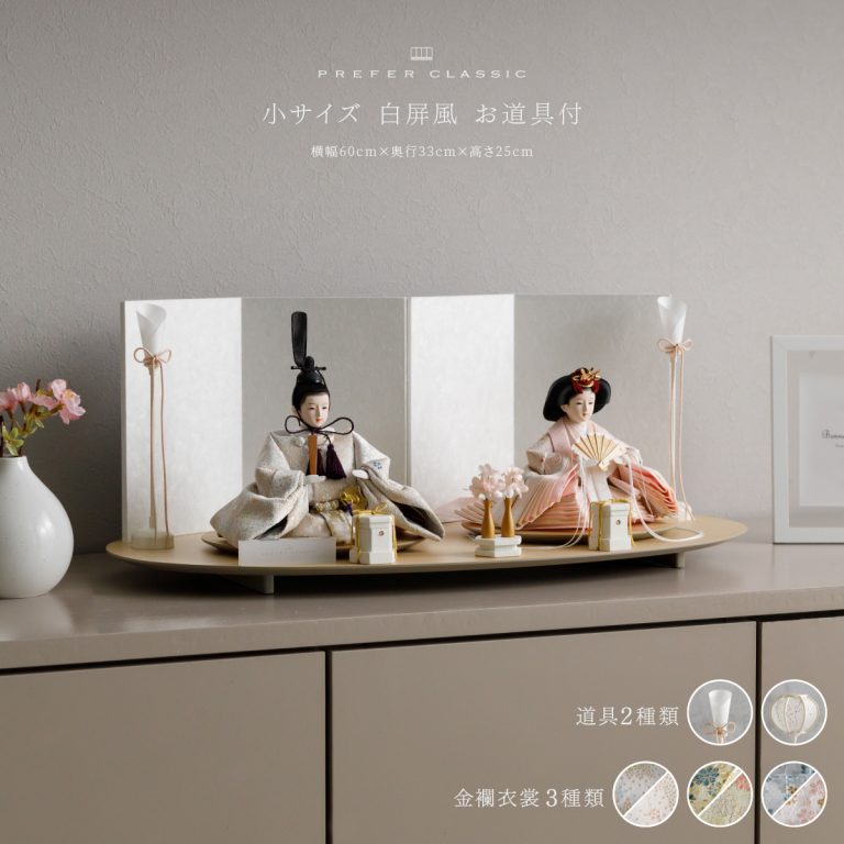 PREFER CLASSIC ひな人形 [丸型台 白屏風 平飾り お道具付 貝桶三方 選べる雪洞2種類 油灯 雪洞 人形小サイズ 選べる金襴衣裳3種類 星欄 羅未 桜央]