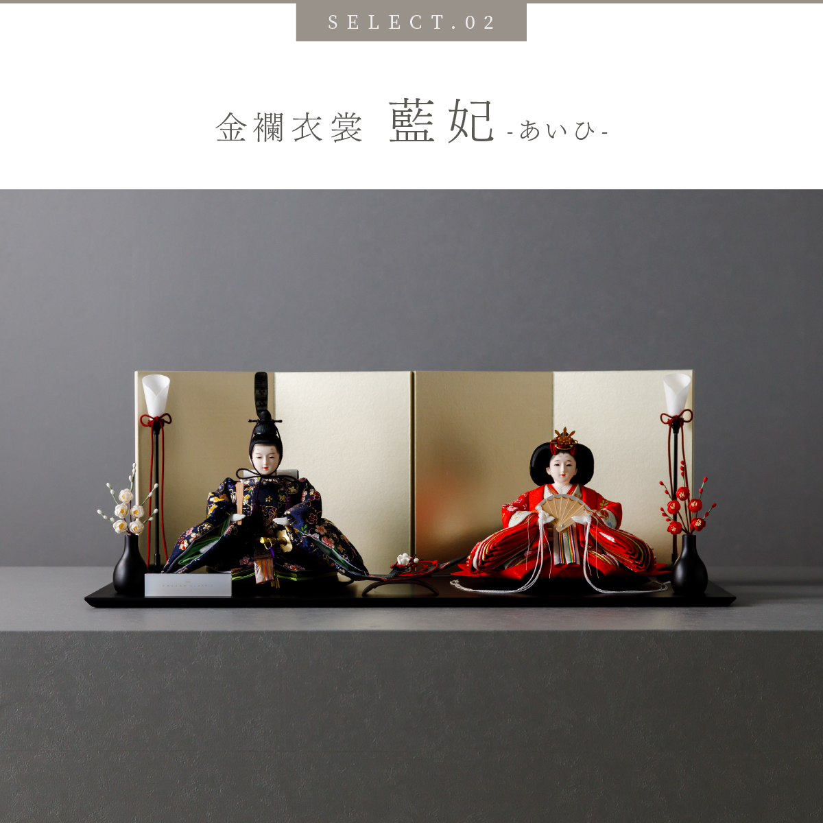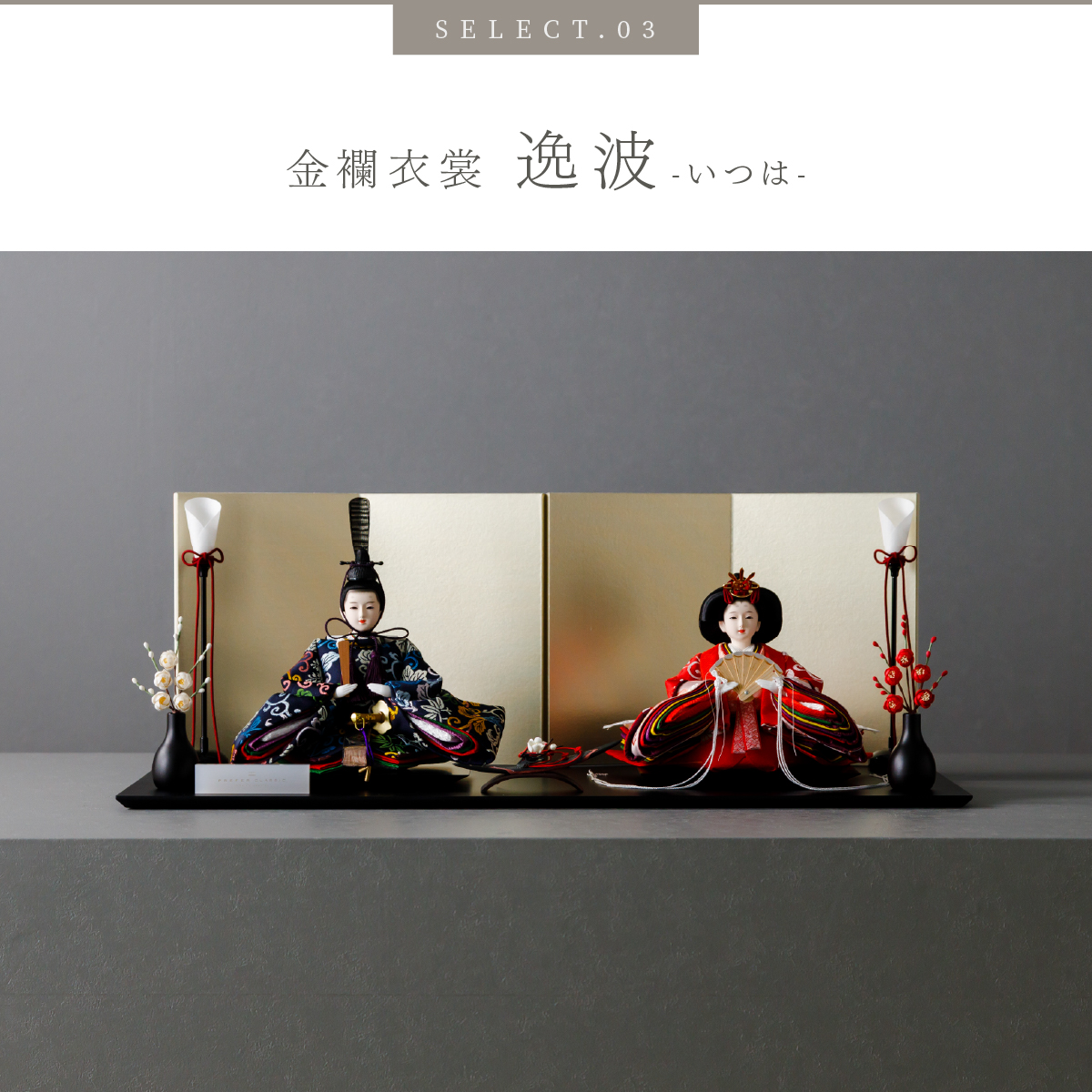 TOP > 雛人形 > ブランド > PREFER CLASSIC > PREFER CLASSIC ひな人形 [黒塗台 平飾り お道具付 紅白梅 三方梅 油灯 選べる屏風2種類 金屏風 白屏風 人形小サイズ 選べる金襴衣裳3種類 理晶 藍妃 逸波]