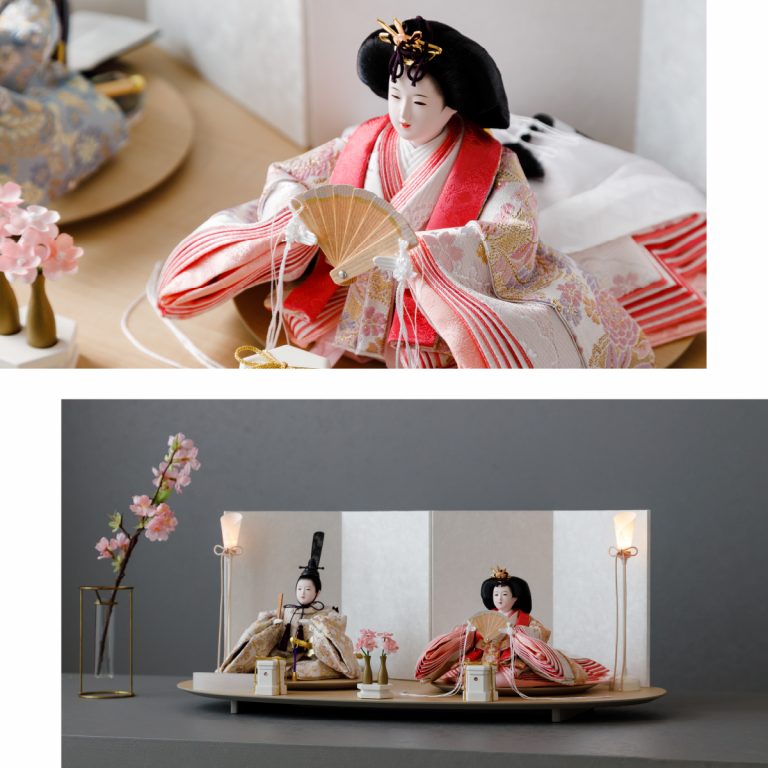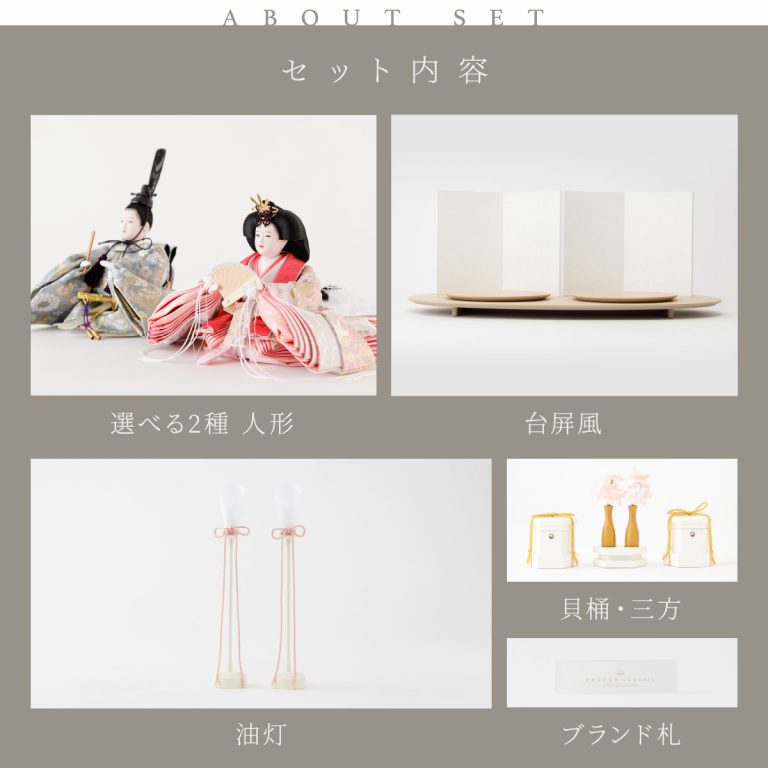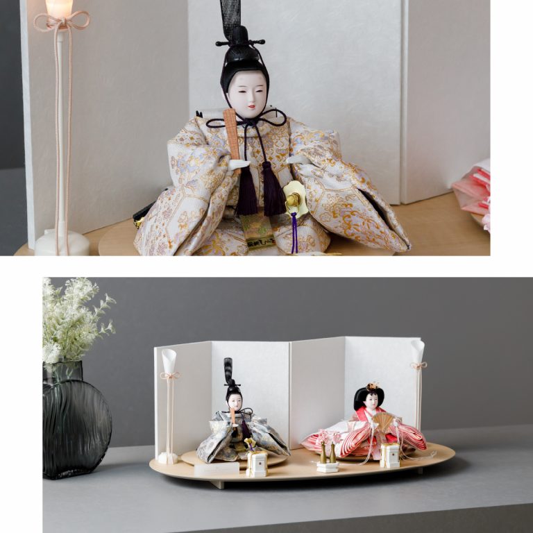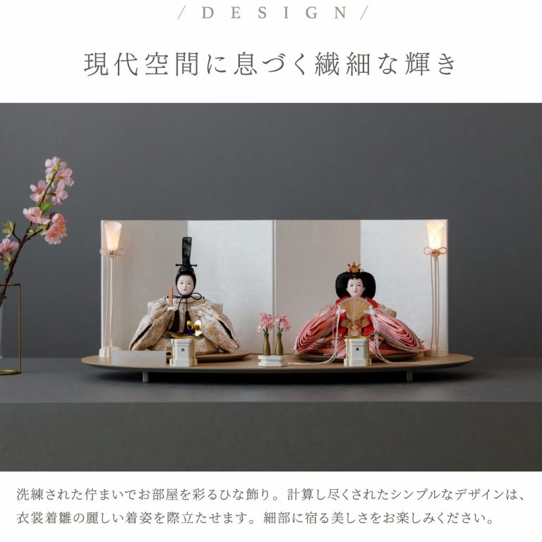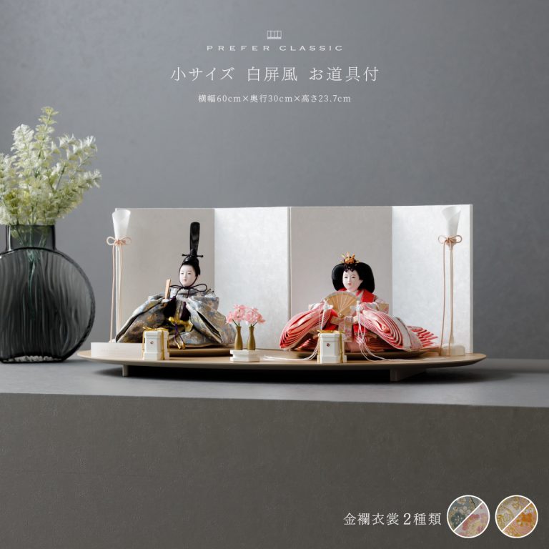 人形のお顔、飾り台、お道具まですべてにこだわり抜いて制作した、preferプロデュースの雛人形。熟練の職人たちがその技術を惜しみなく注いだ、本格派かつ高級志向のハイグレードなおひな様です。流行に左右されないシンプルモダンなスタイルのひな飾りは、時代を超えてどんな日の雛祭りにも華を添えます。衣裳着雛人形の美しい着姿を楽しめる親王飾り。かわいいお顔のお殿様とお姫様が優しく微笑みます。程よくコンパクトなサイズ感。存在感を放ちつつインテリアのようにお部屋に溶け込みます。煌めく金糸を用いた金襴衣裳は、おめでたい日の雰囲気をいっそう盛り上げてくれるでしょう。飾り台には上品な曲線を描く丸型の台座を使用。趣深い白の四曲屏風と共に、ひな人形のお衣裳を引き立てます。組立て不要な平飾りタイプは設置もお手軽。繊細で美しいお道具もセットになり、華やかかつ豪華な雛飾りに仕上げました。雛人形を照らす可愛い油灯はコードレス式。女の子の初節句のお祝いやギフトにおすすめのおひな様です。