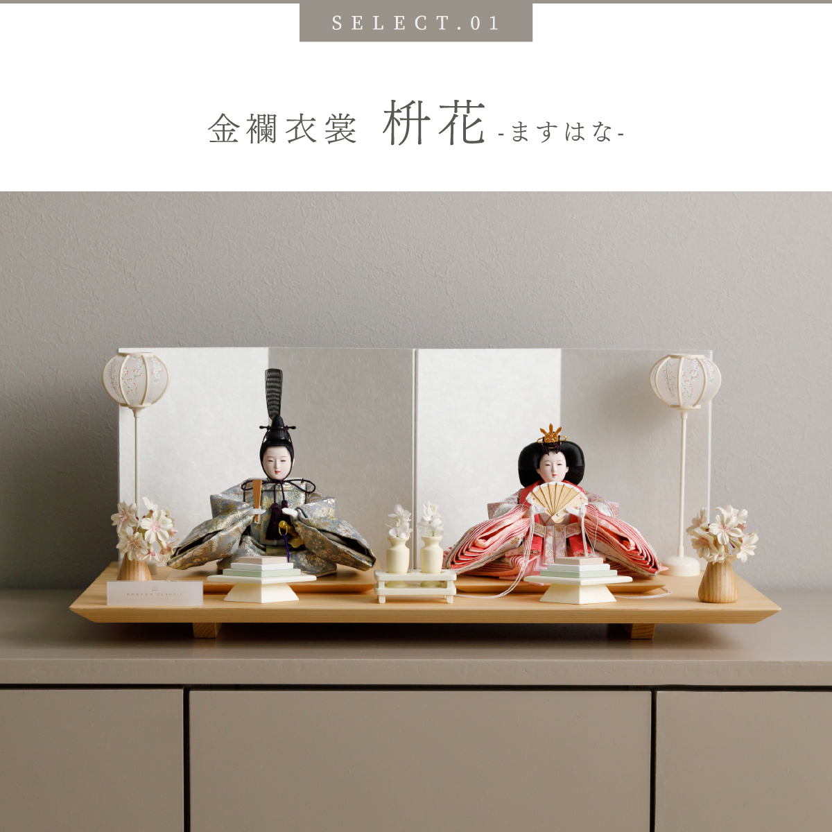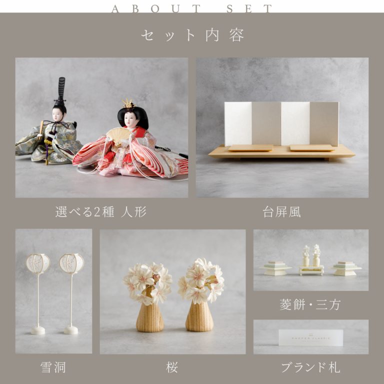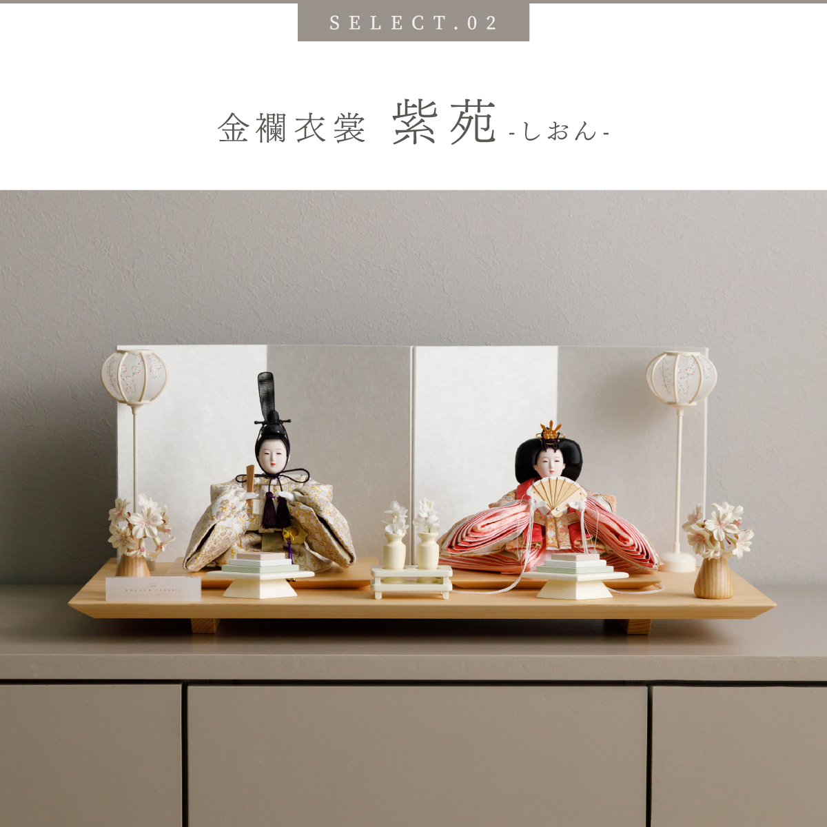 PREFER CLASSIC ひな人形 [檜台 白屏風 平飾り お道具付 菱餅三方 雪洞 人形小サイズ 選べる金襴衣裳2種類 枡花 紫苑]