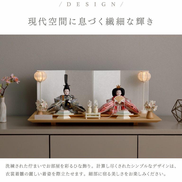 人形のお顔、飾り台、お道具まですべてにこだわり抜いて制作した、preferプロデュースの雛人形。熟練の職人たちがその技術を惜しみなく注いだ、本格派かつ高級志向のハイグレードなおひな様です。流行に左右されないシンプルモダンなスタイルのひな飾りは、時代を超えてどんな日の雛祭りにも華を添えます。衣裳着雛人形の美しい着姿を楽しめる親王飾り。かわいいお顔のお殿様とお姫様が優しく微笑みます。程よくコンパクトなサイズ感。存在感を放ちつつインテリアのようにお部屋に溶け込みます。煌めく金糸を用いた金襴衣裳は、おめでたい日の雰囲気をいっそう盛り上げてくれるでしょう。飾り台には肌目の美しい檜(ヒノキ)の台座を使用。趣深い白の四曲屏風と共に、ひな人形のお衣裳を引き立てます。組立て不要な平飾りタイプは設置もお手軽。繊細で美しいお道具もセットになり、華やかかつ豪華な雛飾りに仕上げました。可愛い雪洞はコードレスタイプです。初節句のお祝いやギフトにおすすめの、最高級の逸品です。