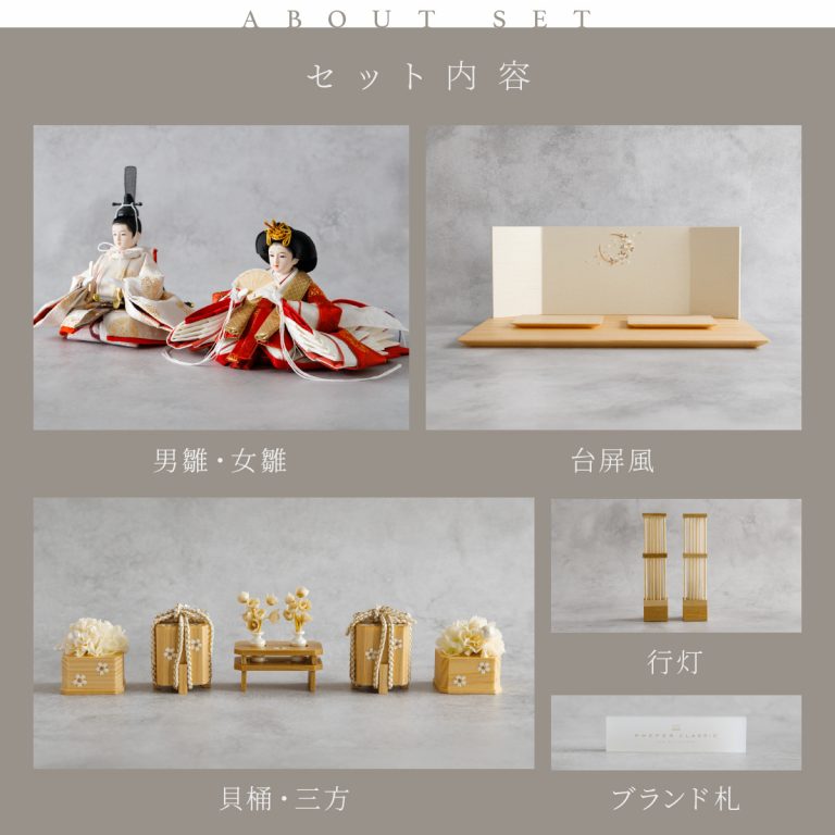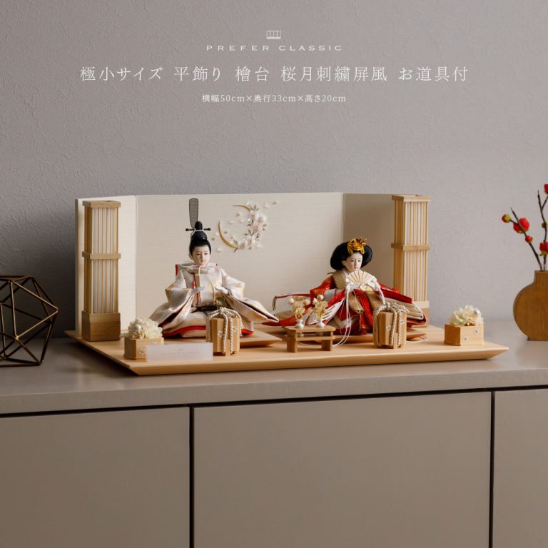 PREFER CLASSIC ひな人形 [檜台 桜月刺繍屏風 平飾り お道具付 貝桶花 駿河行灯 人形極小サイズ 正絹衣裳 凰妃]