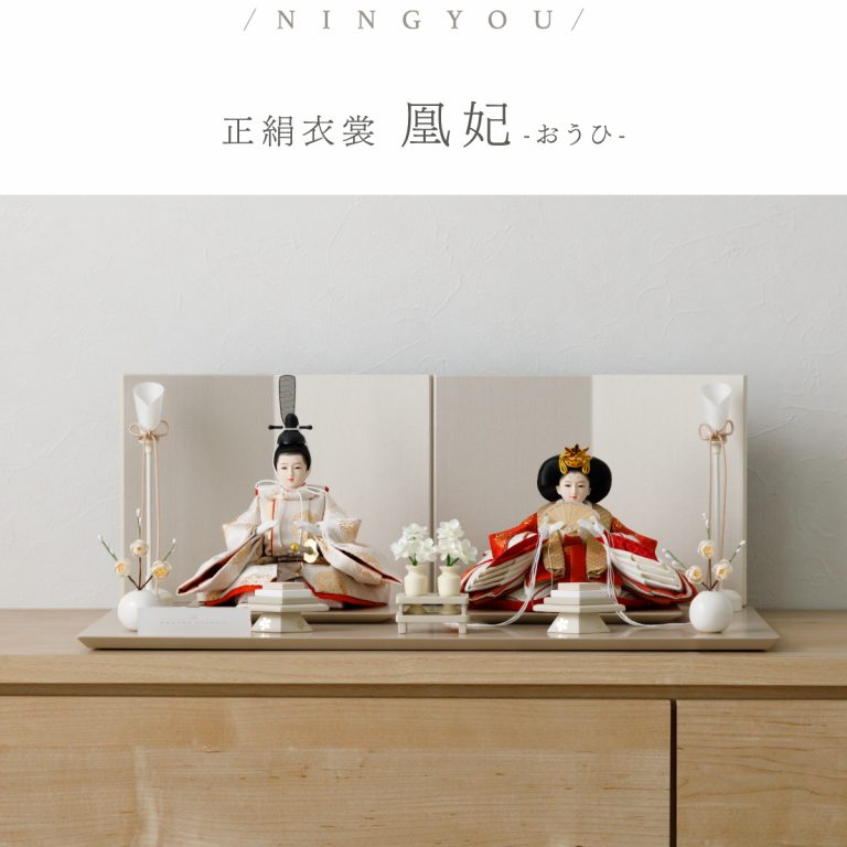 PREFER CLASSIC ひな人形 [ベージュ台 ホワイトグレー屏風 平飾り お道具付 菱餅三方 油灯 白梅 人形極小サイズ 正絹衣裳 凰妃]