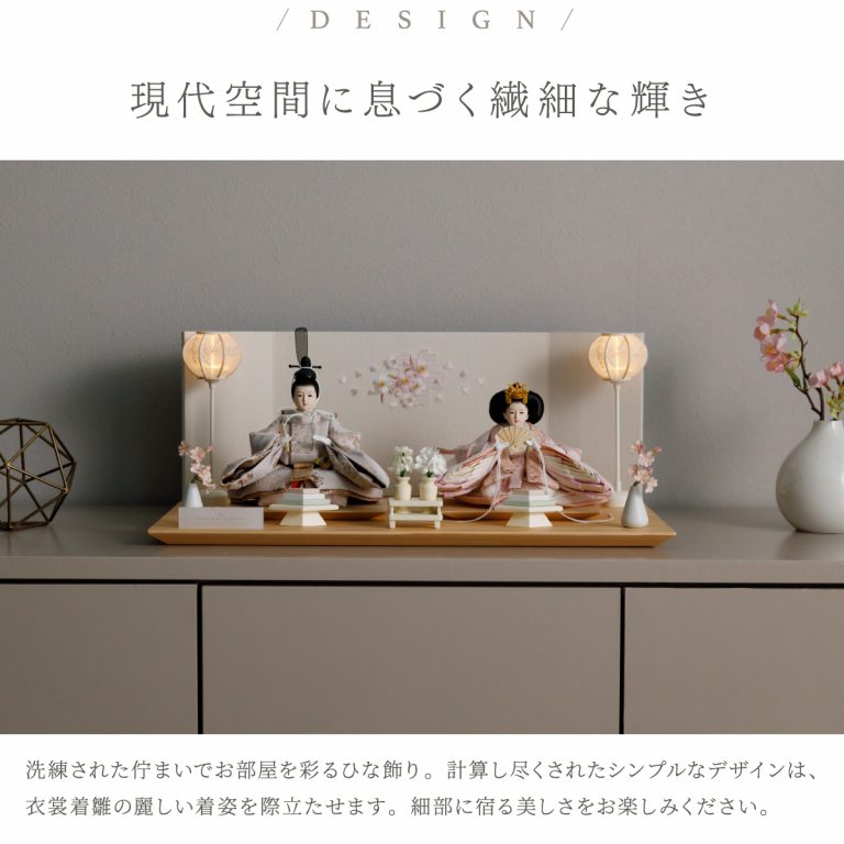 人形のお顔、飾り台、お道具まですべてにこだわり抜いて制作した、preferプロデュースの雛人形。熟練の職人たちがその技術を惜しみなく注いだ、本格派かつ高級志向のハイグレードなおひな様です。流行に左右されないシンプルモダンなスタイルのひな飾りは、時代を超えてどんな日の雛祭りにも華を添えます。衣裳着雛人形の美しい着姿を楽しめる親王飾り。かわいいお顔のお殿様とお姫様が優しく微笑みます。省スペースで楽しめる超コンパクトサイズ。存在感を放ちつつインテリアのようにお部屋に溶け込みます。上品な艶と色合いが美しい人絹生地のお衣裳は、おめでたい日の雰囲気をいっそう盛り上げてくれるでしょう。飾り台には肌目の美しい檜(ヒノキ)の台座を使用。繊細な刺繍を施した屏風と共に、ひな人形のお衣裳を引き立てます。平飾りタイプは組立ても不要でお手軽。繊細で美しいお道具もセットになり、華やかかつ豪華な雛飾りに仕上げました。可愛い雪洞はコードレスタイプです。初節句のお祝いやギフトにおすすめの、最高級の逸品です。