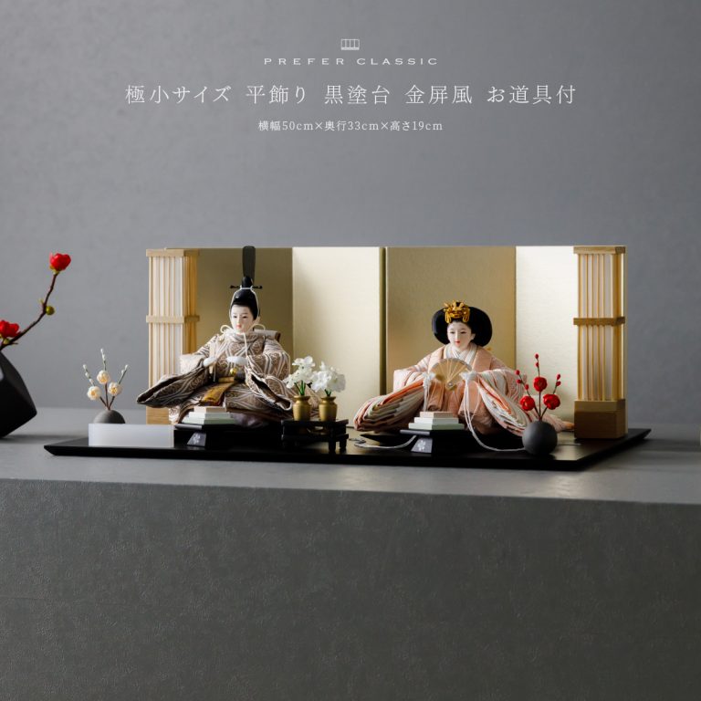 PREFER CLASSIC ひな人形 [黒塗台 金屏風 平飾り お道具付 菱餅三方 駿河行灯 紅白梅 人形極小サイズ 人絹衣裳 此果]