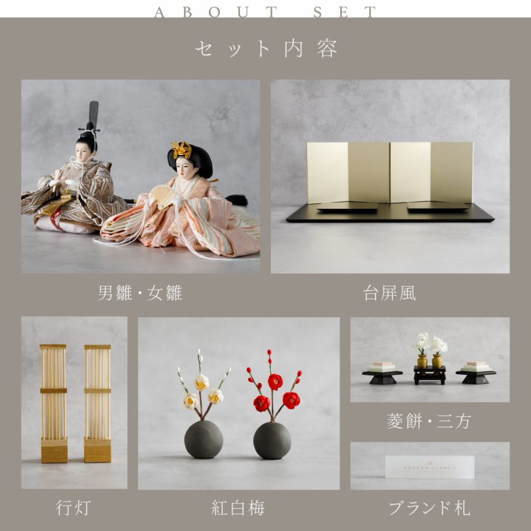 TOP > 雛人形 > ブランド > PREFER CLASSIC > PREFER CLASSIC ひな人形 [黒塗台 金屏風 平飾り お道具付 菱餅三方 駿河行灯 紅白梅 人形極小サイズ 人絹衣裳 此果]