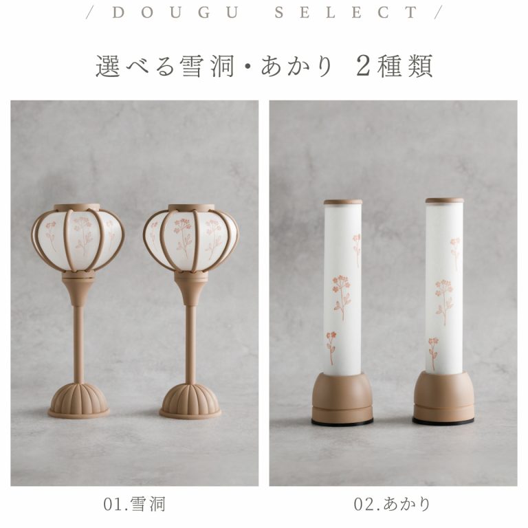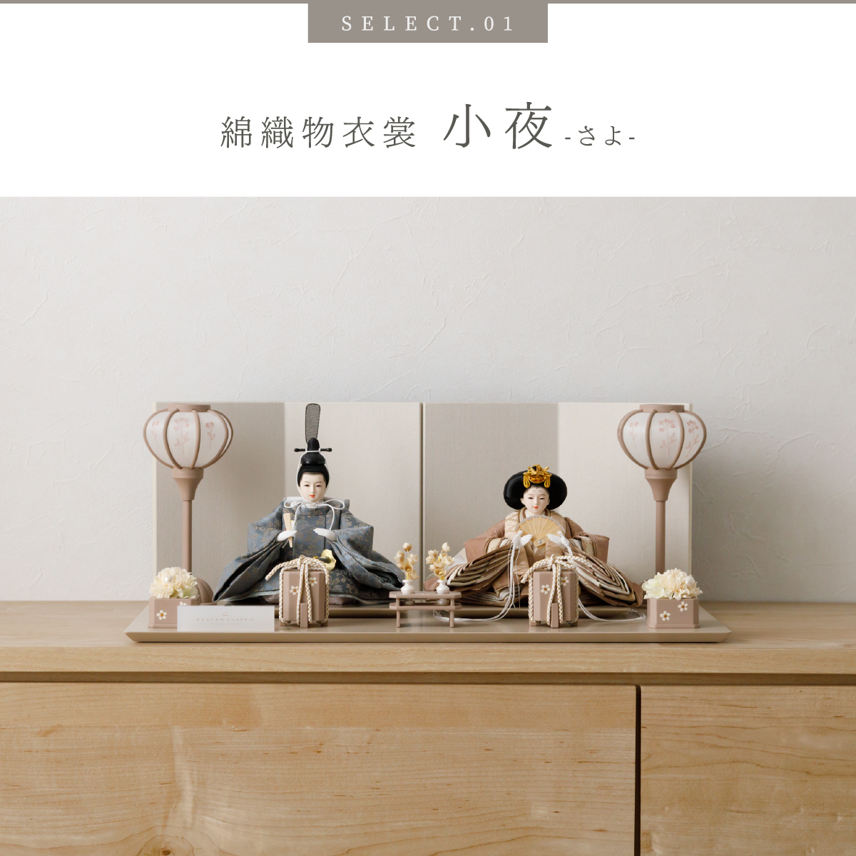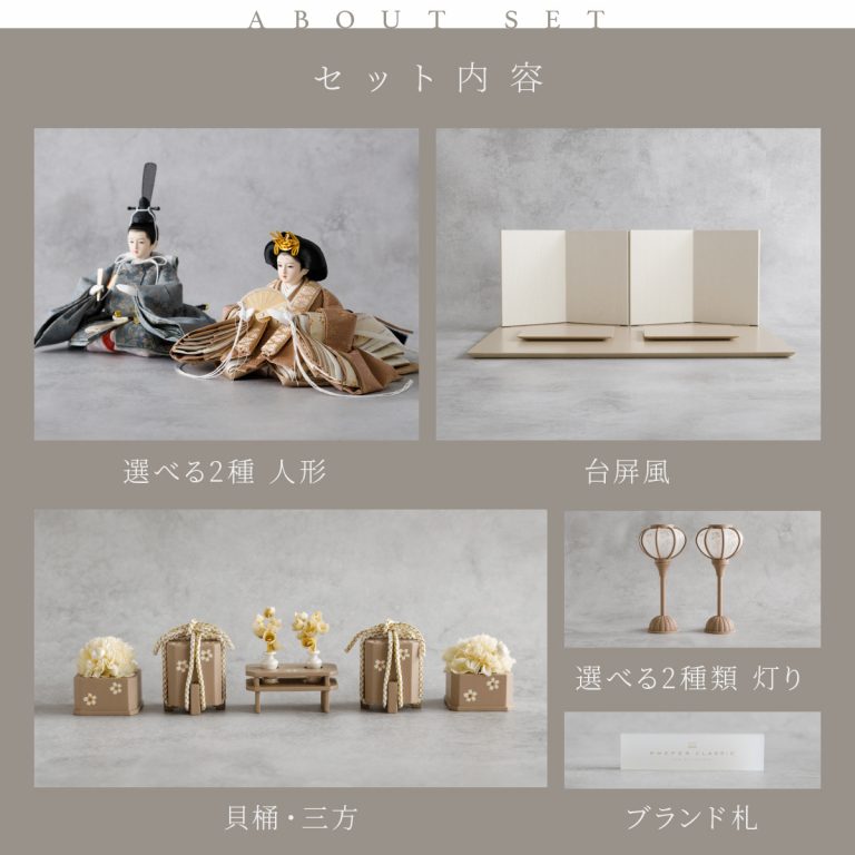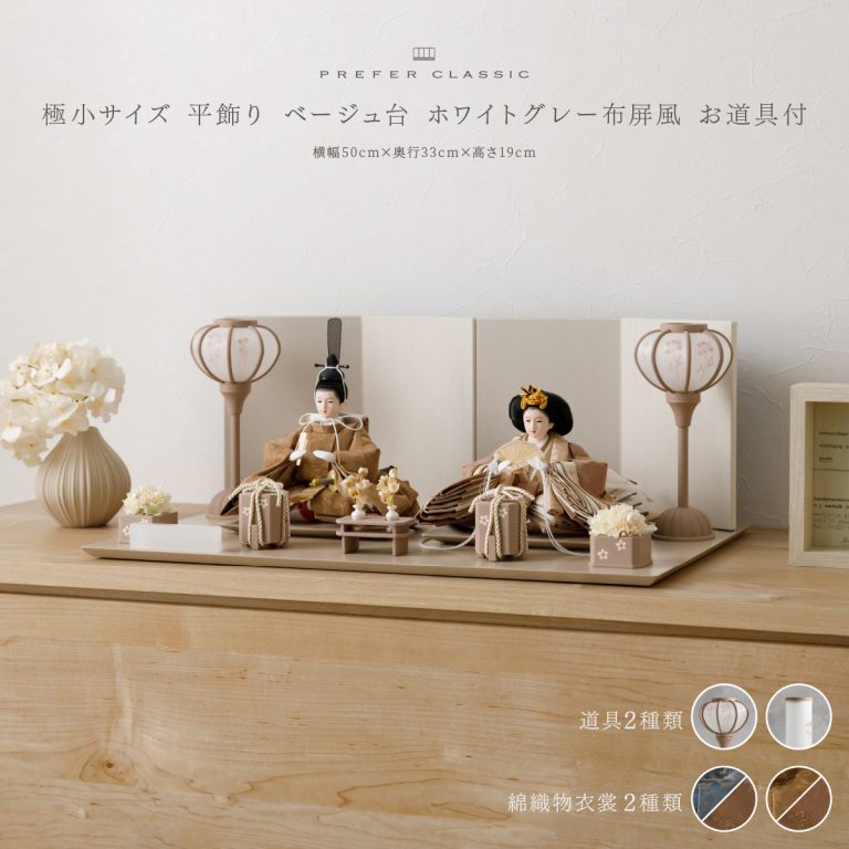 PREFER CLASSIC ひな人形 [ベージュ台 ホワイトグレー屏風 平飾り お道具付 貝桶花 人形極小サイズ 選べる綿織物衣裳2種類 小夜 耶子 選べる灯り2種 雪洞 行灯]