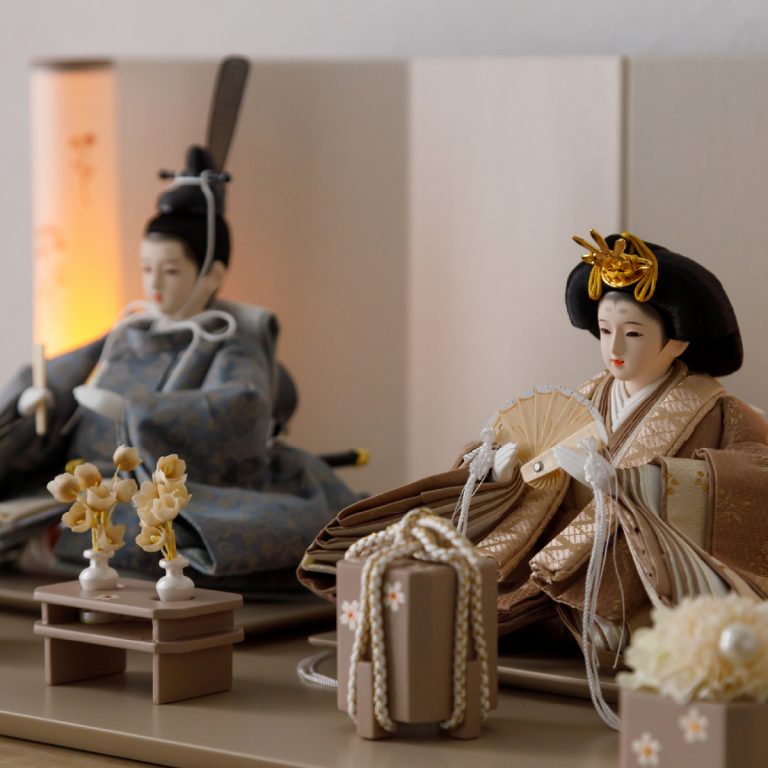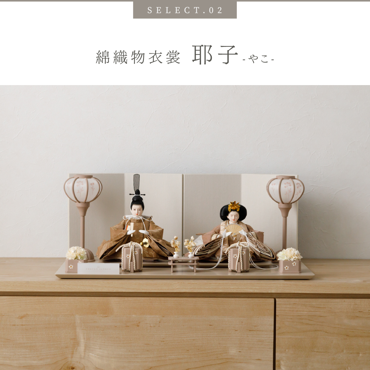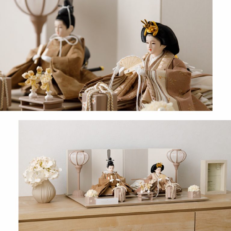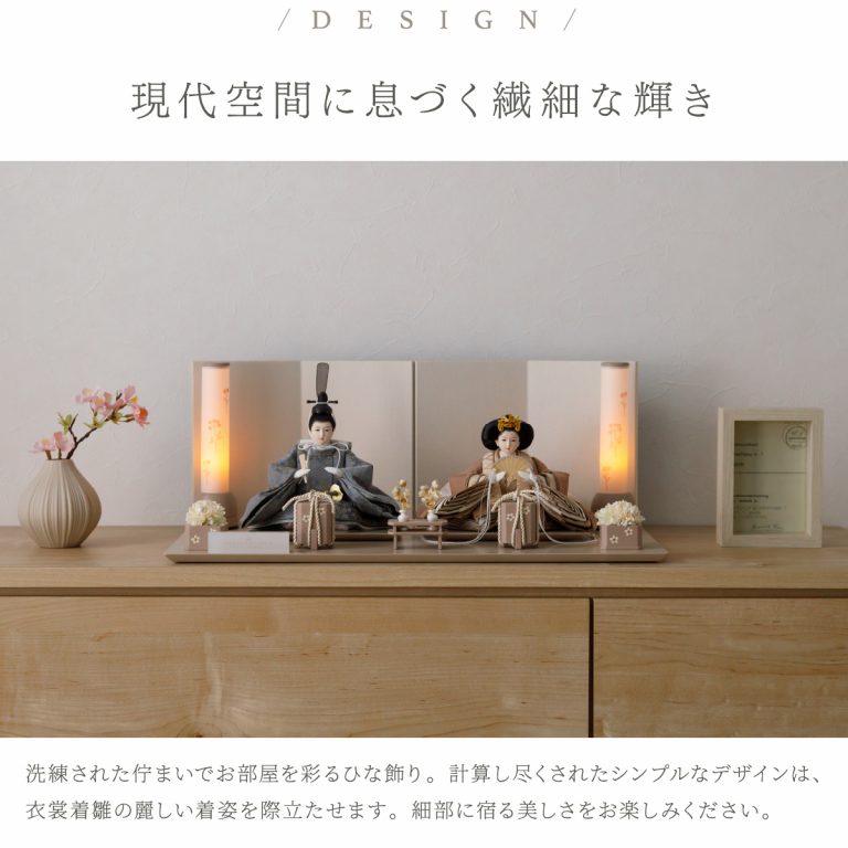 人形のお顔、飾り台、お道具まですべてにこだわり抜いて制作した、preferプロデュースの雛人形。熟練の職人たちがその技術を惜しみなく注いだ、本格派かつ高級志向のハイグレードなおひな様です。流行に左右されないシンプルモダンなスタイルのひな飾りは、時代を超えてどんな日の雛祭りにも華を添えます。衣裳着雛人形の美しい着姿を楽しめる親王飾り。かわいいお顔のお殿様とお姫様が優しく微笑みます。省スペースで楽しめる超コンパクトサイズ。存在感を放ちつつインテリアのようにお部屋に溶け込みます。上品な艶と色合いが美しい綿織物のお衣裳は、おめでたい日の雰囲気をいっそう盛り上げてくれるでしょう。飾り台にはインテリアに合わせやすいベージュの台座を使用。ホワイトグレーの屏風と共に、ひな人形のお衣裳を引き立てます。平飾りタイプは組立ても不要でお手軽。繊細で美しいお道具もセットになり、華やかかつ豪華な雛飾りに仕上げました。雛人形を照らすあかりは雪洞、行灯からお選びください。初節句のお祝いやギフトにおすすめのおひな様です。