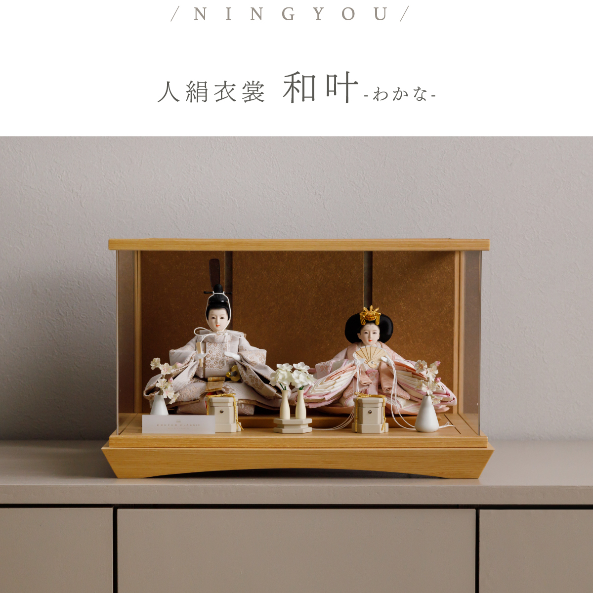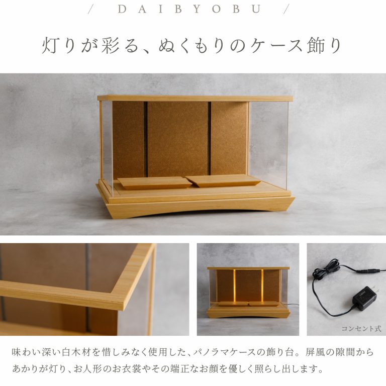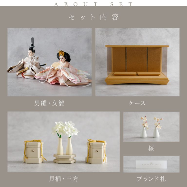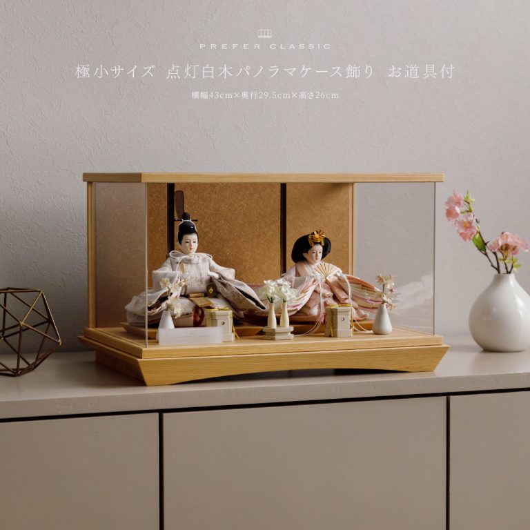 PREFER CLASSIC ひな人形 [点灯白木パノラマケース飾り お道具付 貝桶三方 枝桜白 人形極小サイズ 人絹衣裳 和叶]