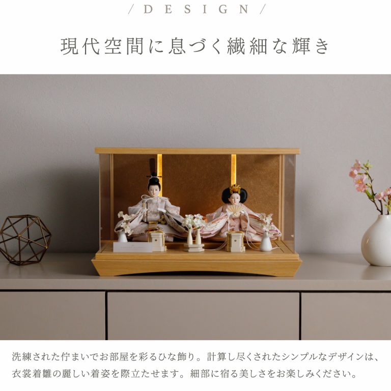 人形のお顔、飾り台、お道具まですべてにこだわり抜いて制作した、preferプロデュースの雛人形。熟練の職人たちがその技術を惜しみなく注いだ、本格派かつ高級志向のハイグレードなおひな様です。流行に左右されないシンプルモダンなスタイルのひな飾りは、時代を超えてどんな日の雛祭りにも華を添えます。衣裳着雛人形の美しい着姿を楽しめる親王飾り。かわいいお顔のお殿様とお姫様が優しく微笑みます。省スペースで楽しめる超コンパクトサイズ。存在感を放ちつつインテリアのようにお部屋に溶け込みます。上品な艶と色合いが美しい人絹生地のお衣裳は、おめでたい日の雰囲気をいっそう盛り上げてくれるでしょう。ケースタイプの飾り台は、背景に優しいあかりが灯る点灯式。ケース飾りはお手入れもお片付けもお手軽です。繊細で美しいお道具もセットになり、華やかかつ豪華な雛飾りに仕上げました。