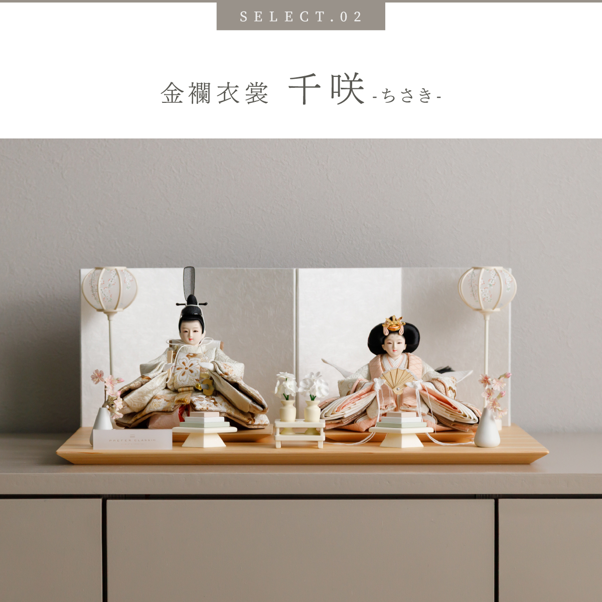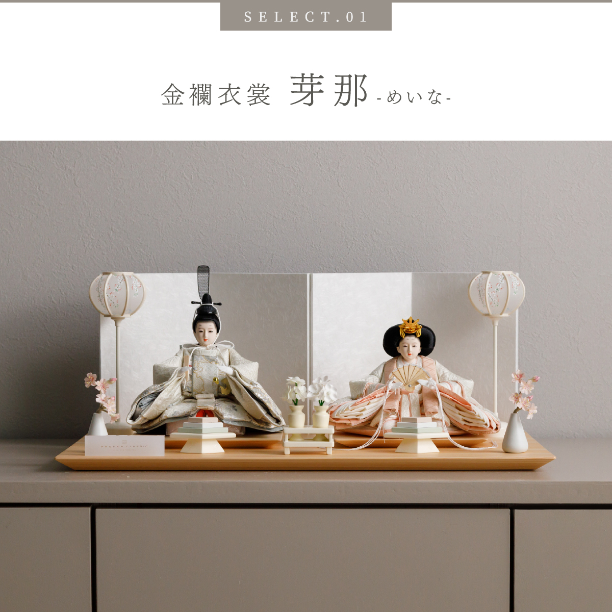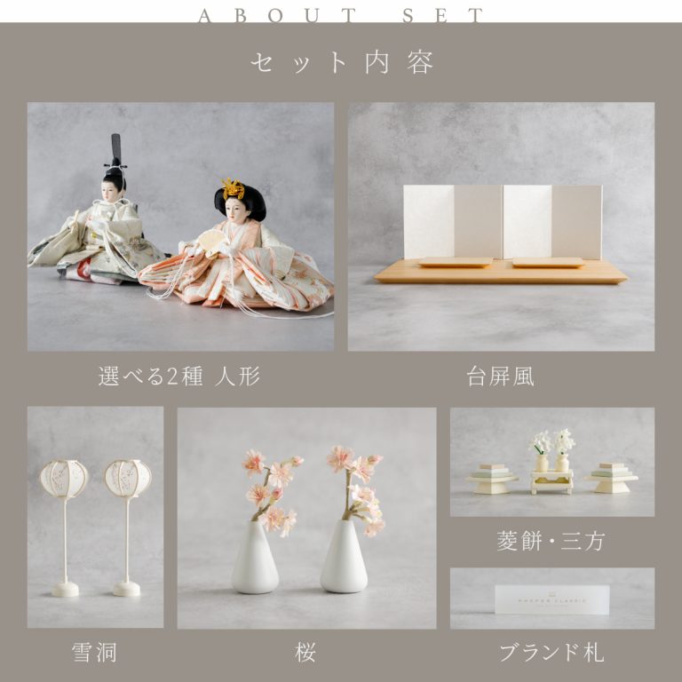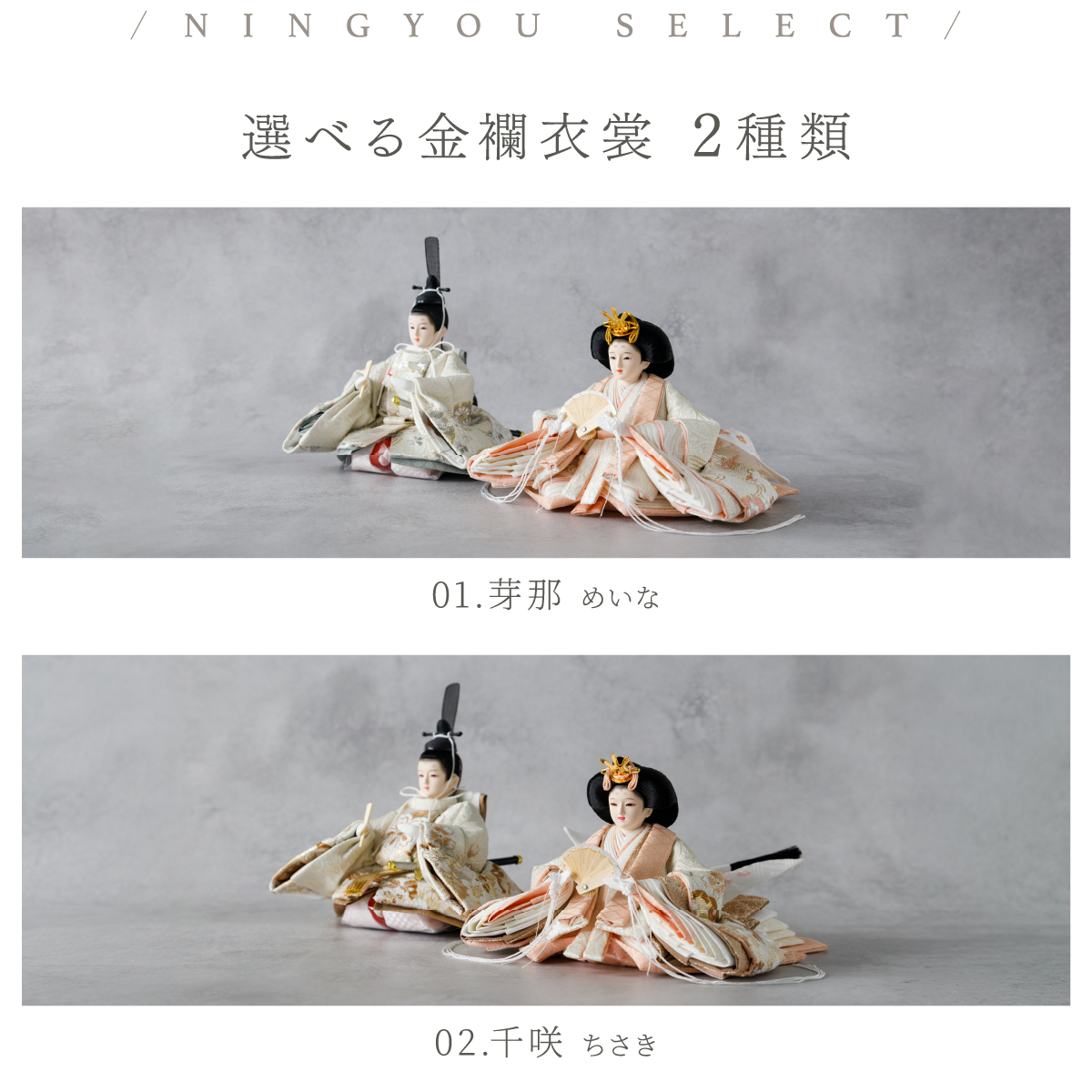 PREFER CLASSIC ひな人形 [檜台 白屏風 平飾り お道具付 菱餅三方 雪洞 枝桜ピンク 人形極小サイズ 選べる金襴衣裳2種類 芽那 千咲]