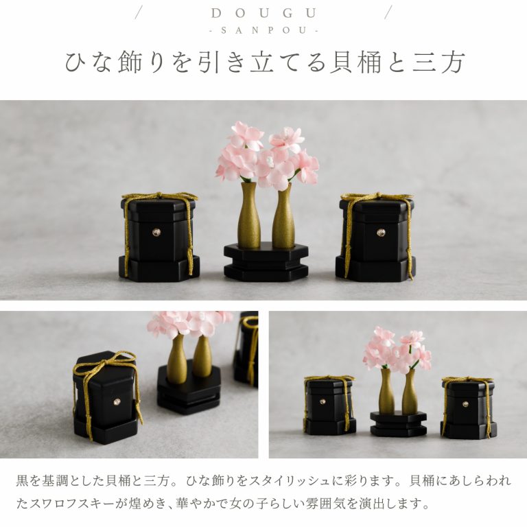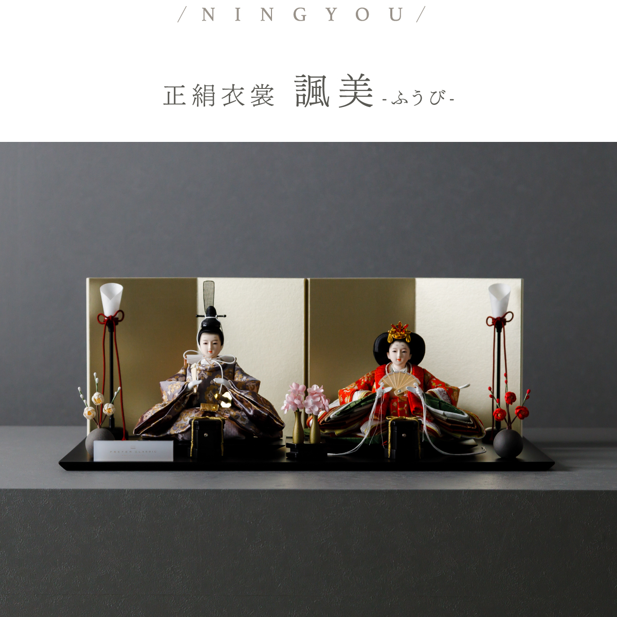 PREFER CLASSIC ひな人形 [黒塗台 金屏風 平飾り お道具付 貝桶三方 紅白梅 油灯 人形極小サイズ 正絹衣裳 諷美]