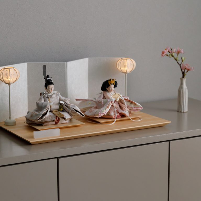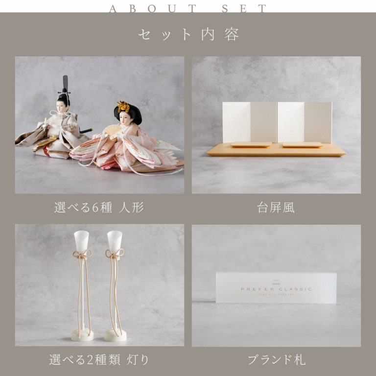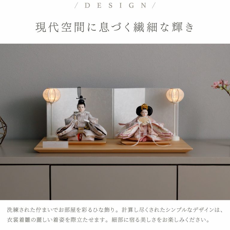 人形のお顔、飾り台、お道具まですべてにこだわり抜いて制作した、preferプロデュースの雛人形。熟練の職人たちがその技術を惜しみなく注いだ、本格派かつ高級志向のハイグレードなおひな様です。流行に左右されないシンプルモダンなスタイルのひな飾りは、時代を超えてどんな日の雛祭りにも華を添えます。衣裳着雛人形の美しい着姿を楽しめる親王飾り。かわいいお顔のお殿様とお姫様が優しく微笑みます。省スペースで楽しめる超コンパクトサイズ。存在感を放ちつつインテリアのようにお部屋に溶け込みます。上品な艶と色合いが美しい人絹生地のお衣裳は、おめでたい日の雰囲気をいっそう盛り上げてくれるでしょう。飾り台には肌目の美しい檜(ヒノキ)の台座を使用。趣深い白の四曲屏風と共に、ひな人形のお衣裳を引き立てます。組立て不要な平飾りタイプは設置もお手軽。あえてお道具を配さないシンプルなスタイルの雛飾りは、お人形そのものの美しさを際立たせます。雛人形を照らすあかりは雪洞、油灯からお選びください。初節句のお祝いやギフトにおすすめのおひな様です。