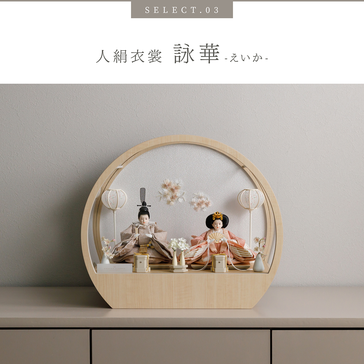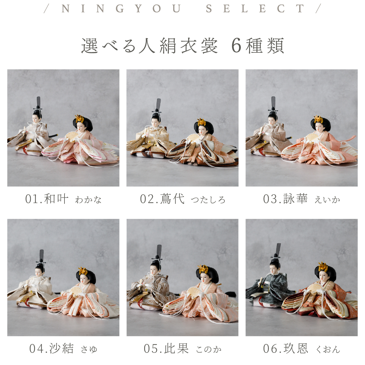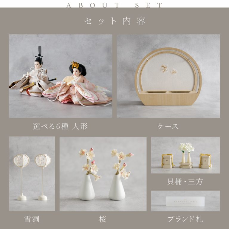 PREFER CLASSIC ひな人形 [丸型ケース飾り お道具付 貝桶三方 雪洞 枝桜白 人形極小サイズ 選べる人絹衣裳6種類 和叶 蔦代 詠華 沙結 此果 玖恩]