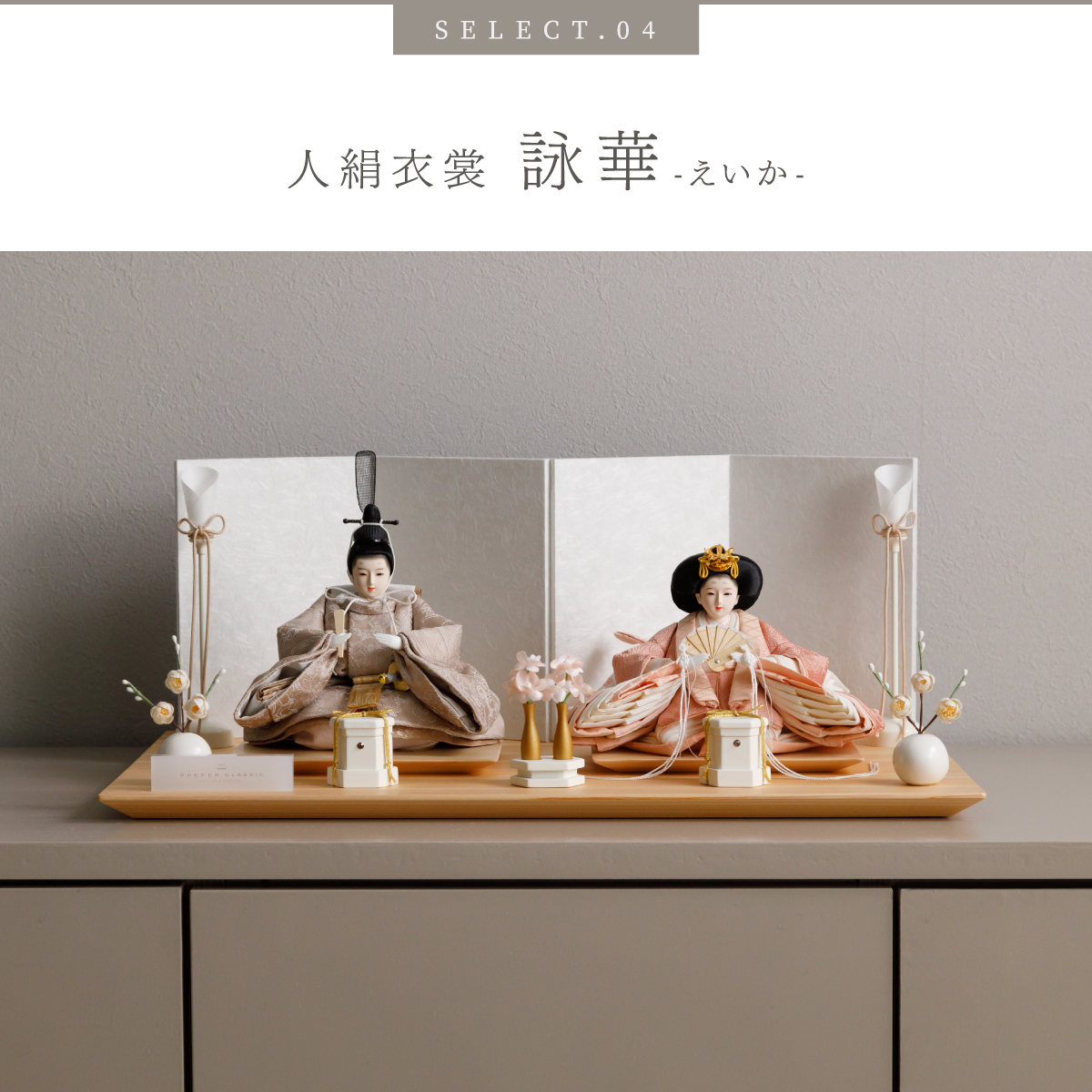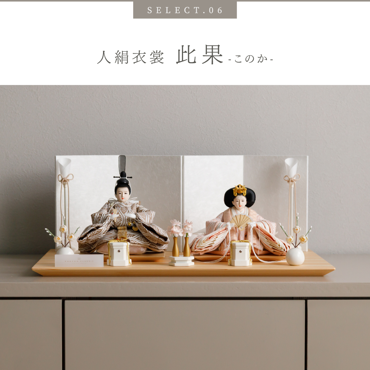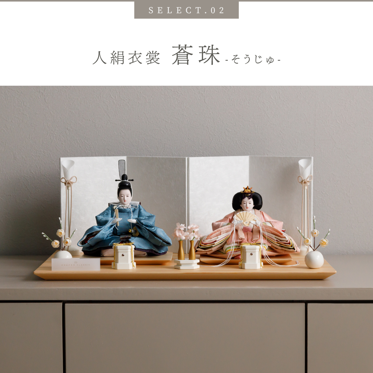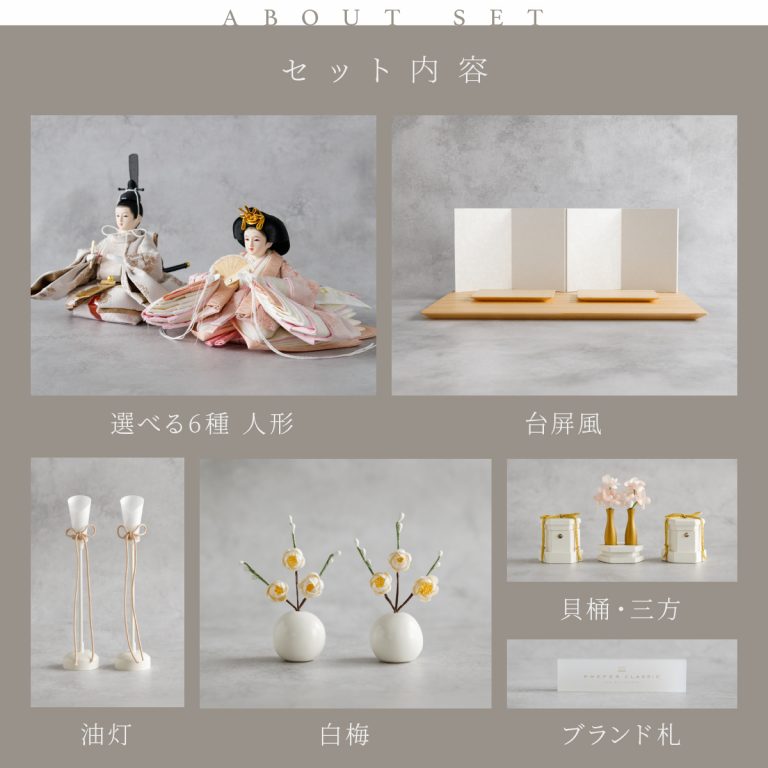 PREFER CLASSIC ひな人形 [檜台 白屏風 平飾り お道具付 貝桶三方 油灯 白梅 人形極小サイズ 選べる人絹衣裳6種類 和叶 蒼珠 蔦代 詠華 沙結 此果]