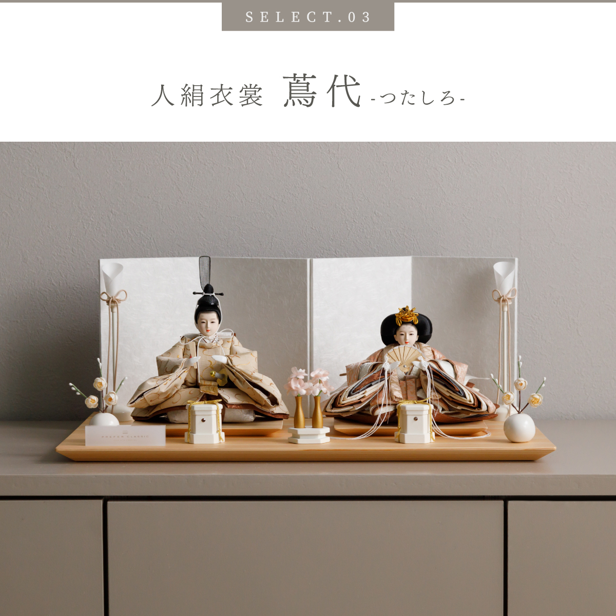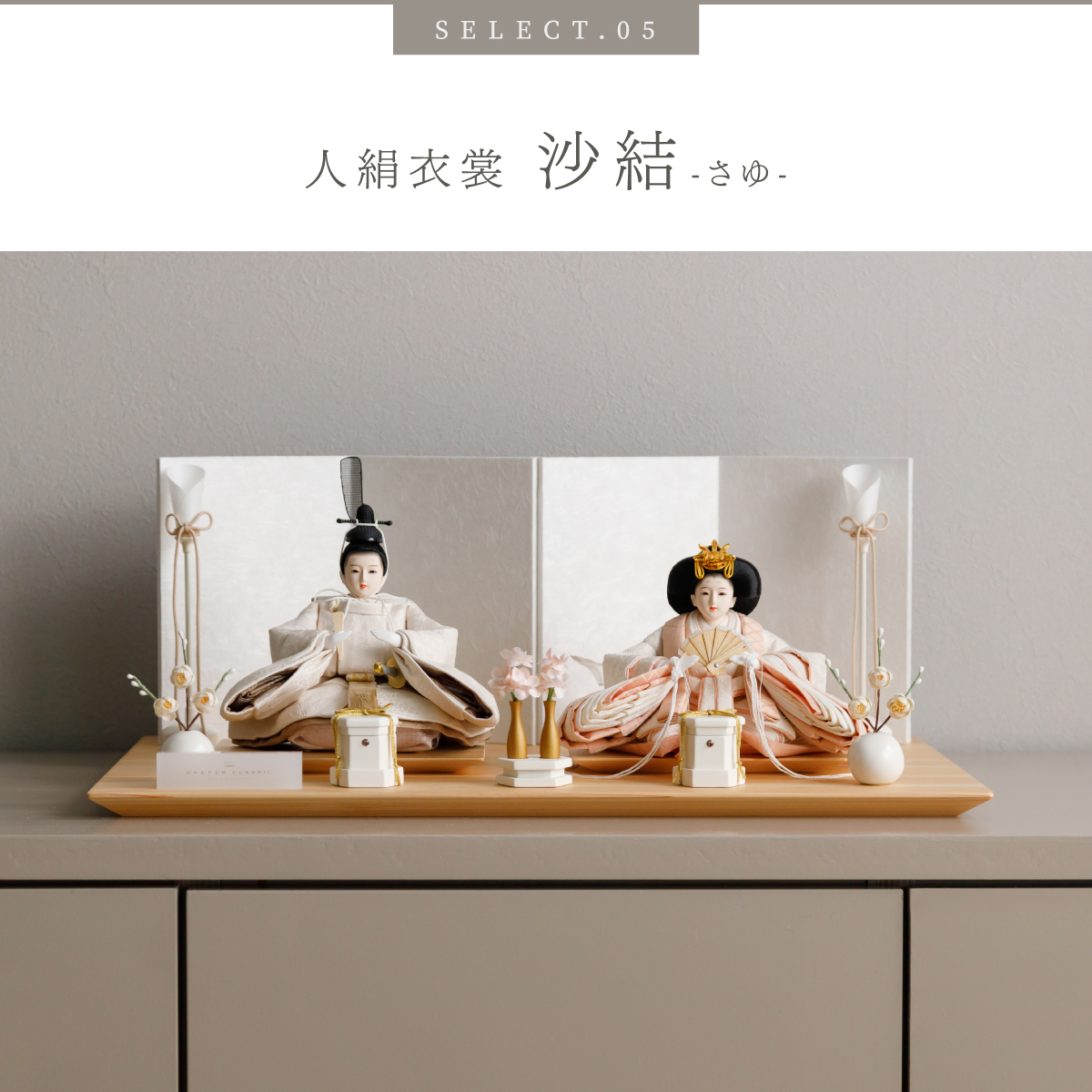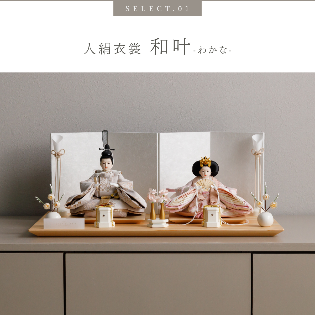 PREFER CLASSIC ひな人形 [檜台 白屏風 平飾り お道具付 貝桶三方 油灯 白梅 人形極小サイズ 選べる人絹衣裳6種類 和叶 蒼珠 蔦代 詠華 沙結 此果]