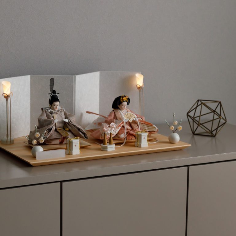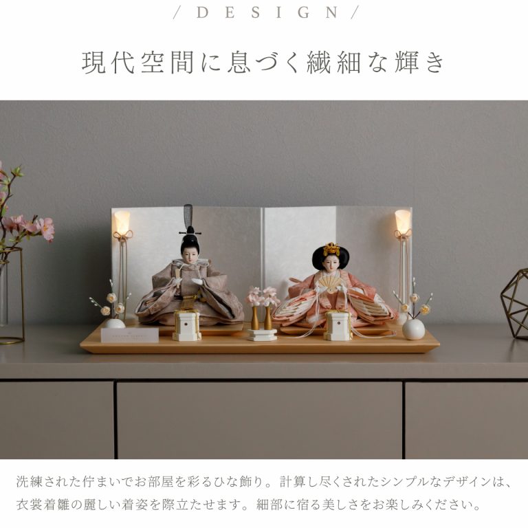 人形のお顔、飾り台、お道具まですべてにこだわり抜いて制作した、preferプロデュースの雛人形。熟練の職人たちがその技術を惜しみなく注いだ、本格派かつ高級志向のハイグレードなおひな様です。流行に左右されないシンプルモダンなスタイルのひな飾りは、時代を超えてどんな日の雛祭りにも華を添えます。衣裳着雛人形の美しい着姿を楽しめる親王飾り。かわいいお顔のお殿様とお姫様が優しく微笑みます。省スペースで楽しめる超コンパクトサイズ。存在感を放ちつつインテリアのようにお部屋に溶け込みます。上品な艶と色合いが美しい人絹生地のお衣裳は、おめでたい日の雰囲気をいっそう盛り上げてくれるでしょう。飾り台には肌目の美しい檜(ヒノキ)の台座を使用。趣深い白の四曲屏風と共に、ひな人形のお衣裳を引き立てます。組立て不要な平飾りタイプは設置もお手軽。繊細で美しいお道具もセットになり、華やかかつ豪華な雛飾りに仕上げました。雛人形を照らす可愛い油灯はコードレス式。女の子の初節句のお祝いやギフトにおすすめのおひな様です。