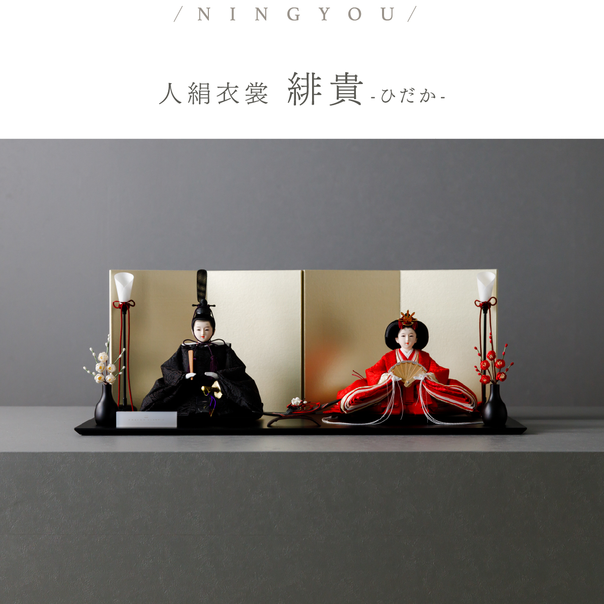 PREFER CLASSIC ひな人形 [黒塗台 金屏風 平飾り お道具付 三方梅 油灯 紅白梅 人形小サイズ 人絹衣裳 緋貴]