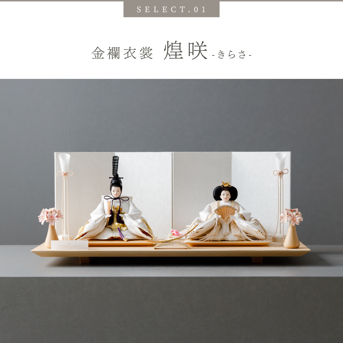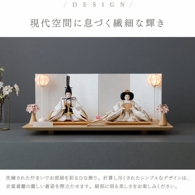 人形のお顔、飾り台、お道具まですべてにこだわり抜いて制作した、preferプロデュースの雛人形。熟練の職人たちがその技術を惜しみなく注いだ、本格派かつ高級志向のハイグレードなおひな様です。流行に左右されないシンプルモダンなスタイルのひな飾りは、時代を超えてどんな日の雛祭りにも華を添えます。衣裳着雛人形の美しい着姿を楽しめる親王飾り。かわいいお顔のお殿様とお姫様が優しく微笑みます。程よくコンパクトなサイズ感。存在感を放ちつつインテリアのようにお部屋に溶け込みます。煌めく金糸を用いた金襴衣裳は、おめでたい日の雰囲気をいっそう盛り上げてくれるでしょう。飾り台には肌目の美しい檜(ヒノキ)の台座を使用。趣深い白の四曲屏風と共に、ひな人形のお衣裳を引き立てます。組立て不要な平飾りタイプは設置もお手軽。繊細で美しいお道具もセットになり、華やかかつ豪華な雛飾りに仕上げました。雛人形を照らすあかりは雪洞、油灯からお選びください。初節句のお祝いやギフトにおすすめのおひな様です。