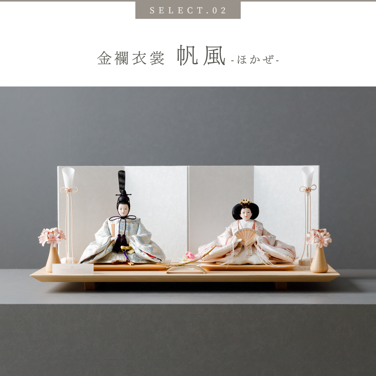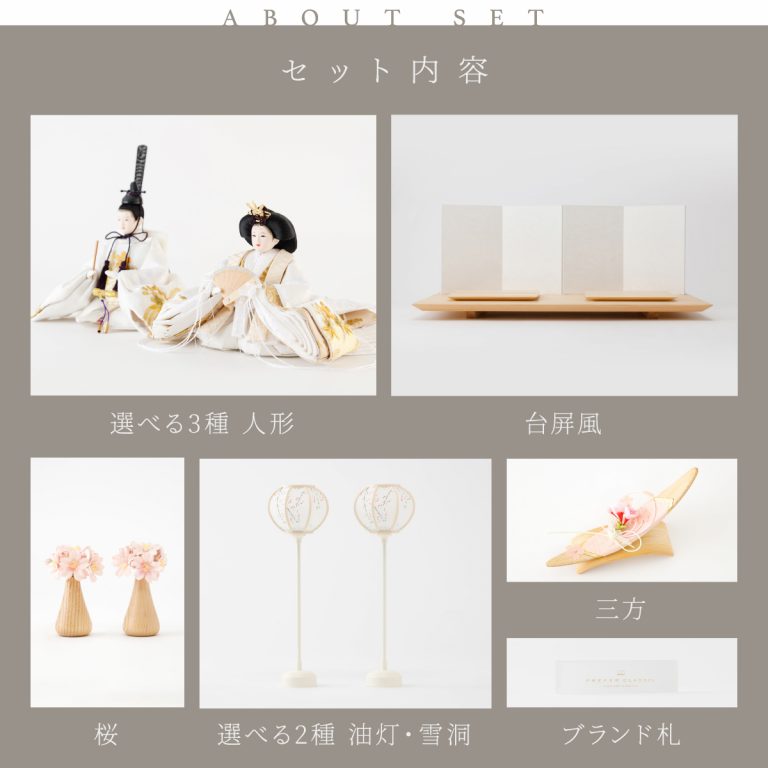 PREFER CLASSIC ひな人形 [檜台 白屏風 平飾り お道具付 和桜 三方桜 選べる灯り2種類 油灯 雪洞 人形小サイズ 選べる金襴衣裳3種類 煌咲 帆風 白帆]