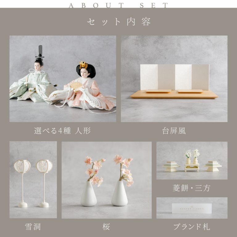 PREFER CLASSIC ひな人形 [檜台 白屏風 平飾り お道具付 菱餅三方 雪洞 枝桜ピンク 人形極小サイズ 選べる正絹衣裳4種類 碧櫻 采禾 美文 瑚透]